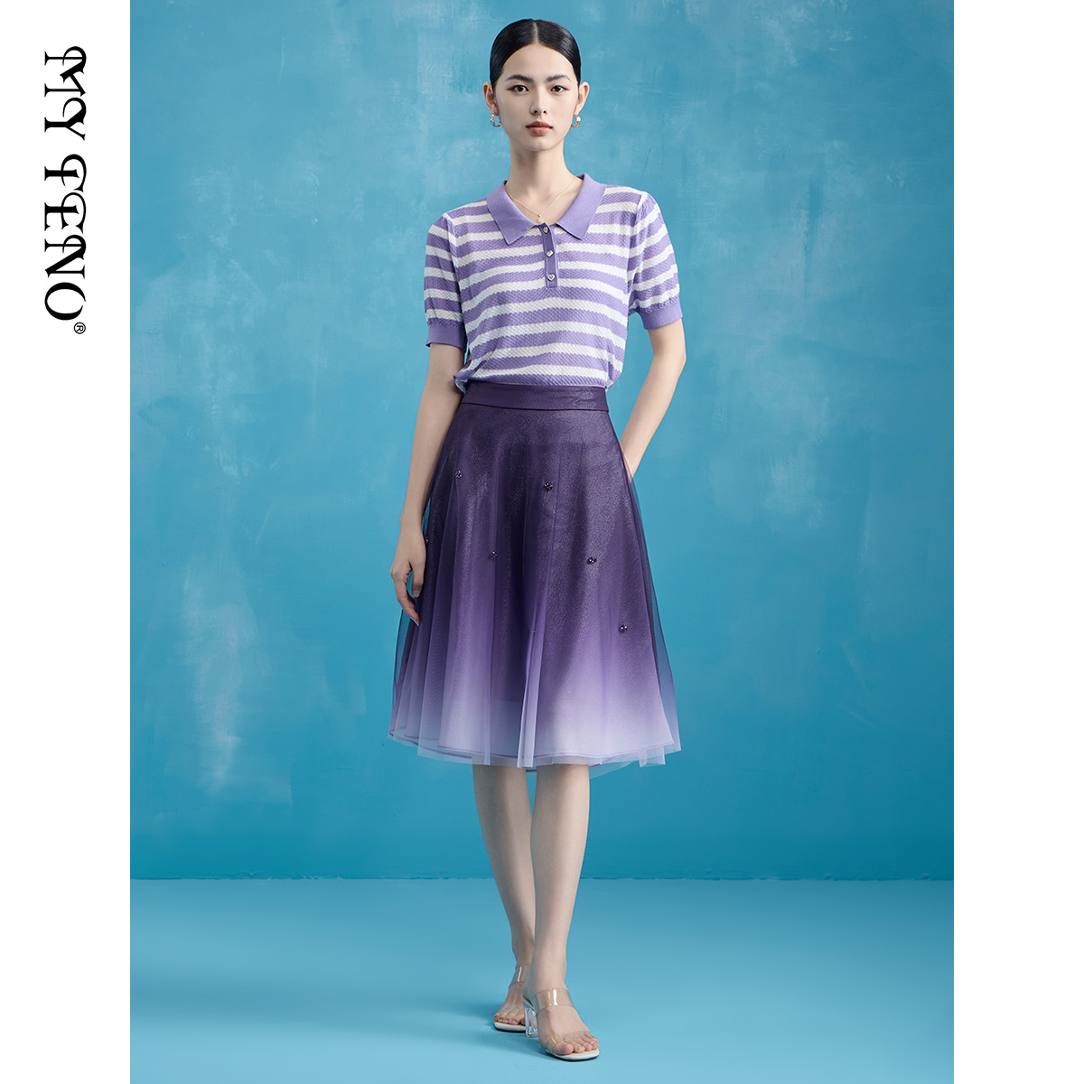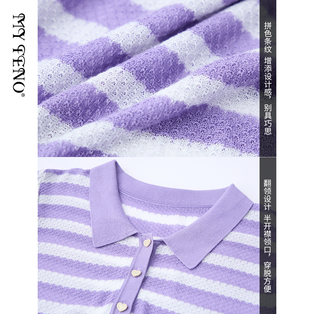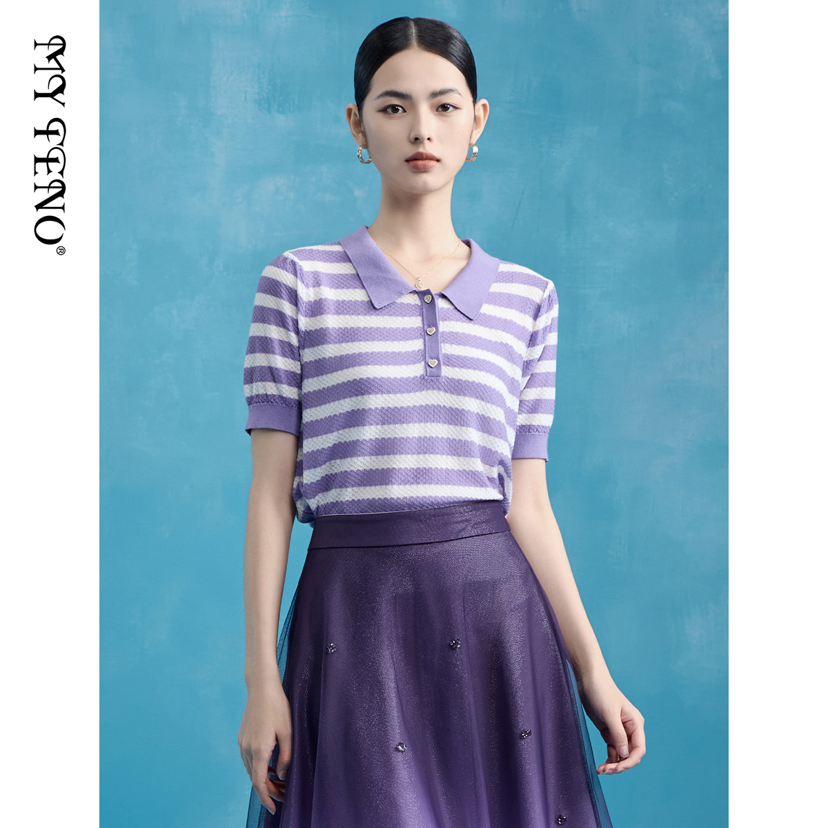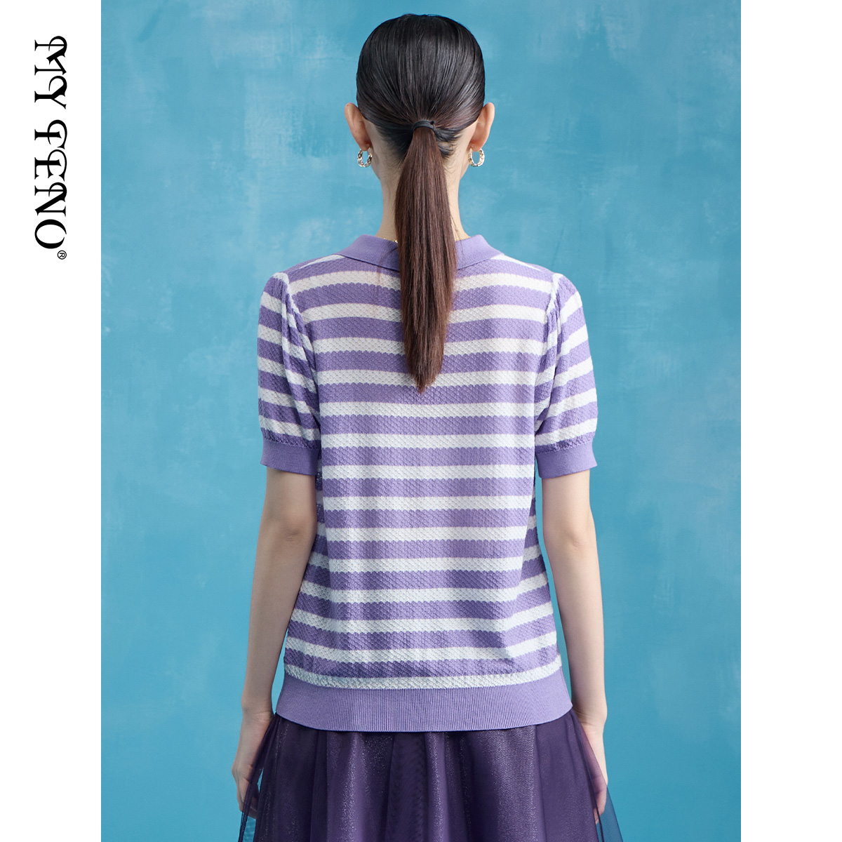 马天奴夏季新款紫色条纹POLO领纽扣短袖修身针织衫上衣时尚流行