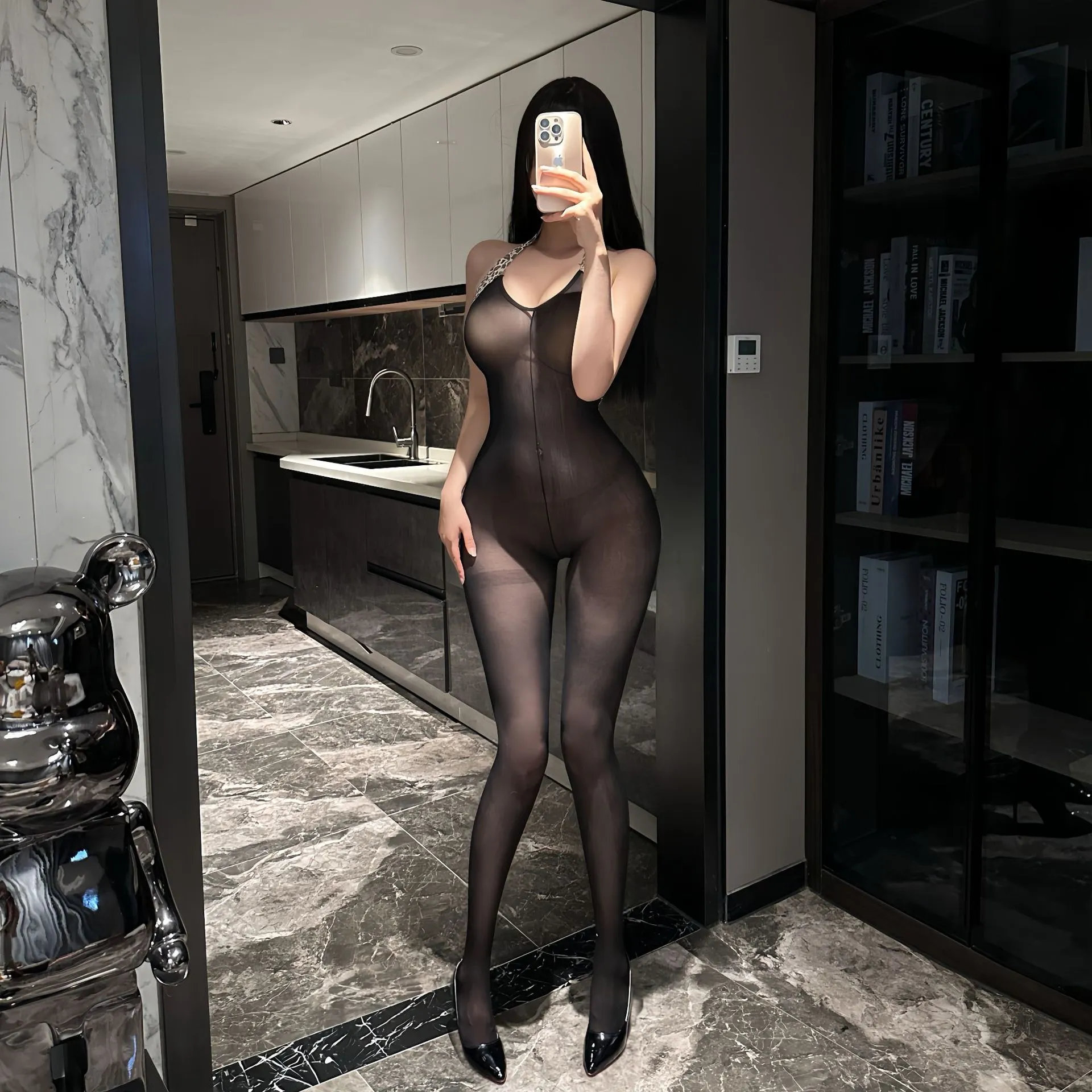 5329潮尚夜总会桑拿性感内衣豹纹边挂脖连身透明睡裙套装连体衣