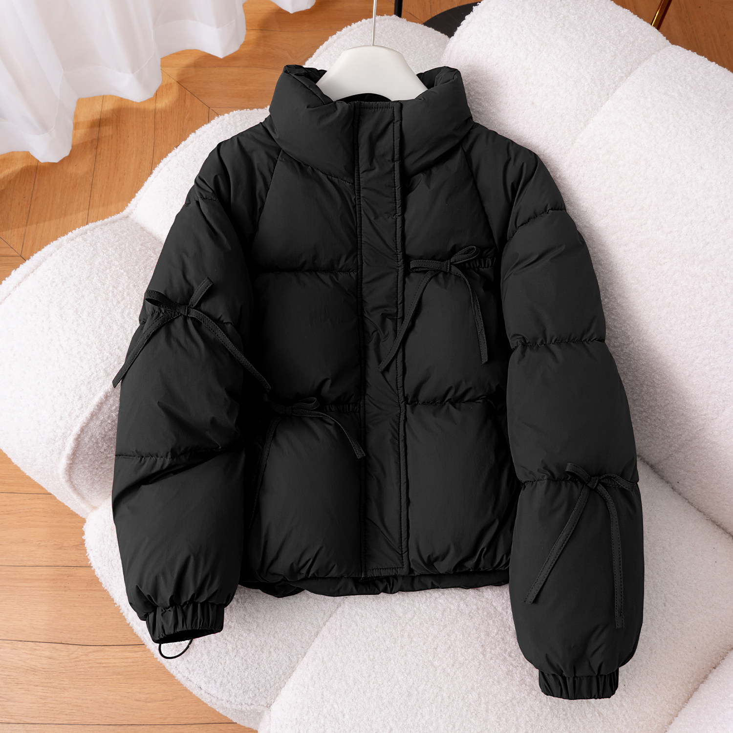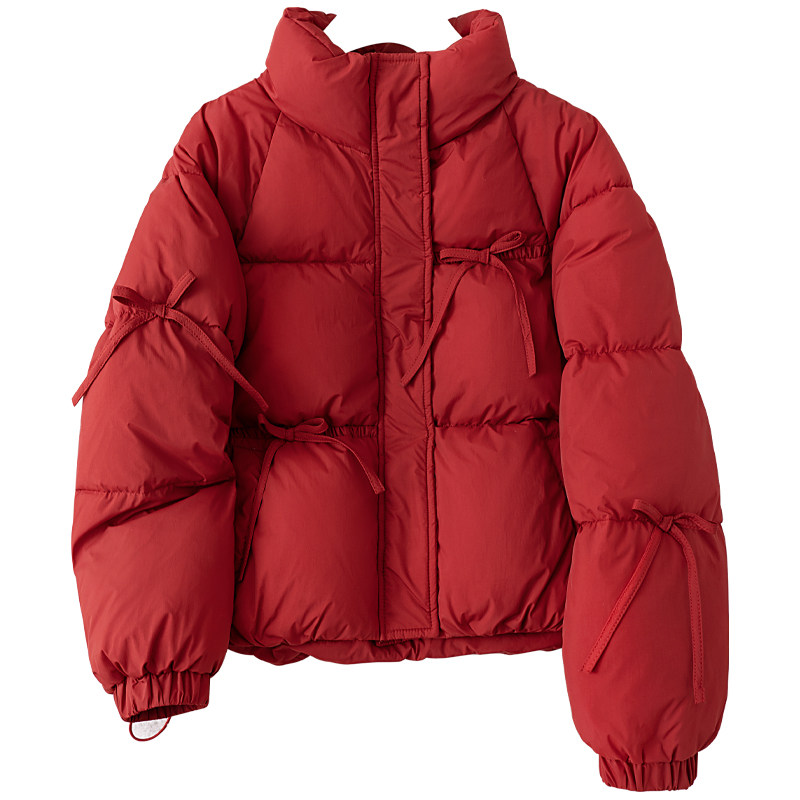 红色立领面包服短款棉袄厚女冬季2025新款宽松保暖蝴蝶结棉服外套