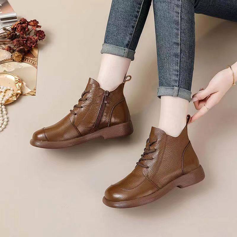 头层牛皮短靴秋季新款马丁靴粗跟防滑真皮复古百搭女靴手工妈妈鞋