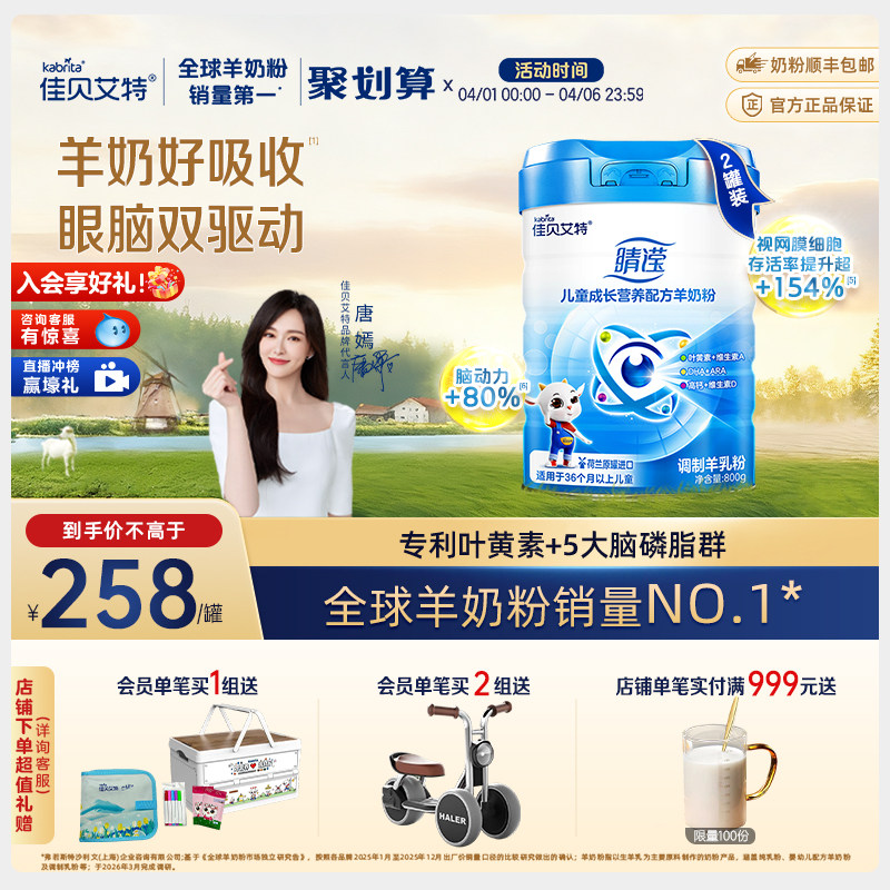 新国标 佳贝艾特睛滢儿童学生成长营养配方羊奶粉800g*2罐