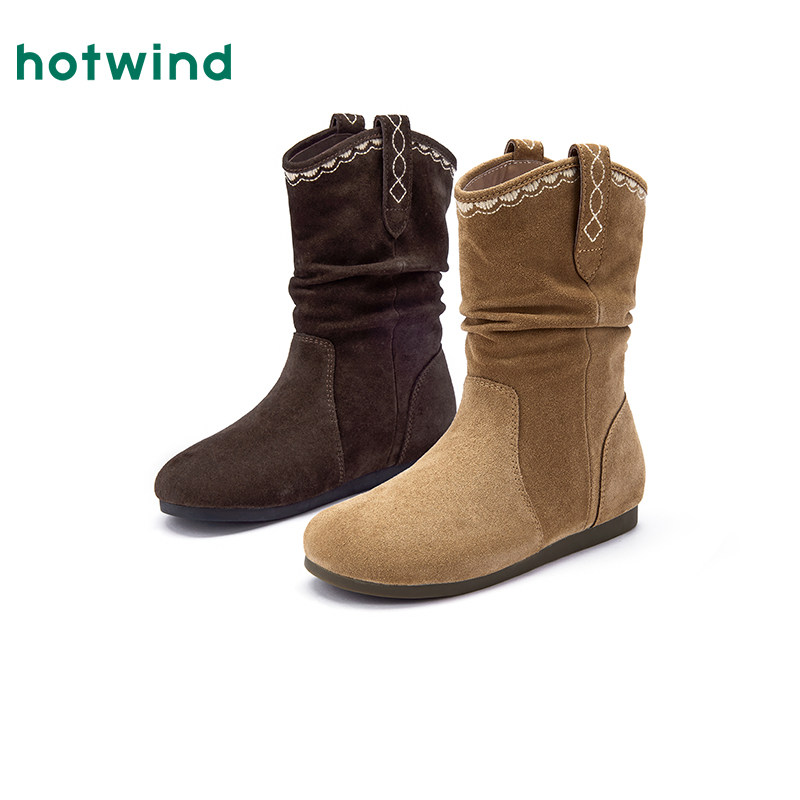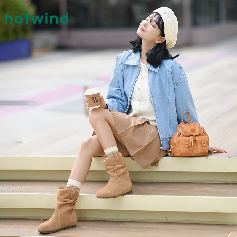 热风复古西部靴女2025年冬季新款棕色牛仔靴百搭美拉德短靴子女鞋