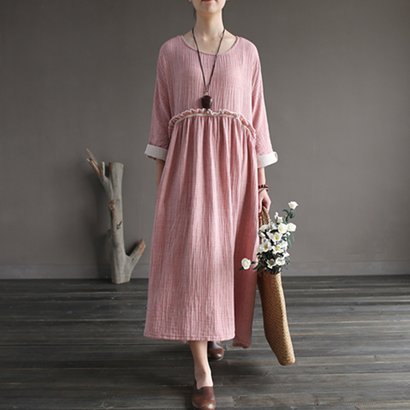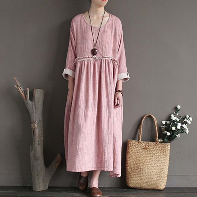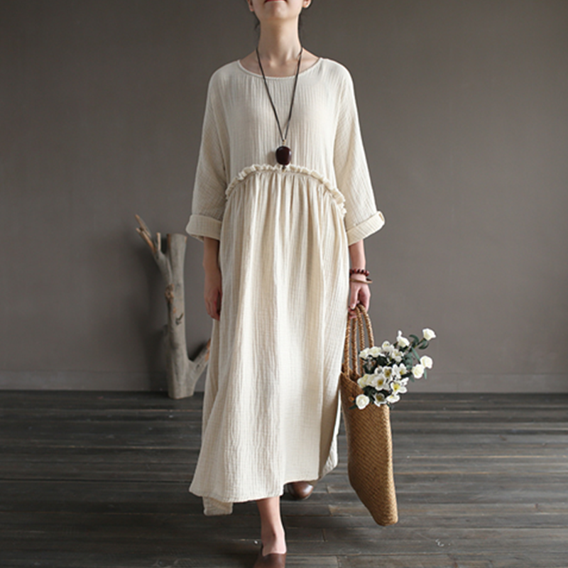 原创春夏季女装休闲中长款棉麻双层皱连衣裙文艺复古清新宽松长裙