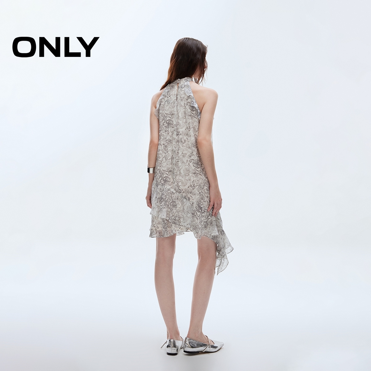 o区绫致ONLY2025春季淑女挂脖圆领不规则荷叶边短裙碎花连衣裙女