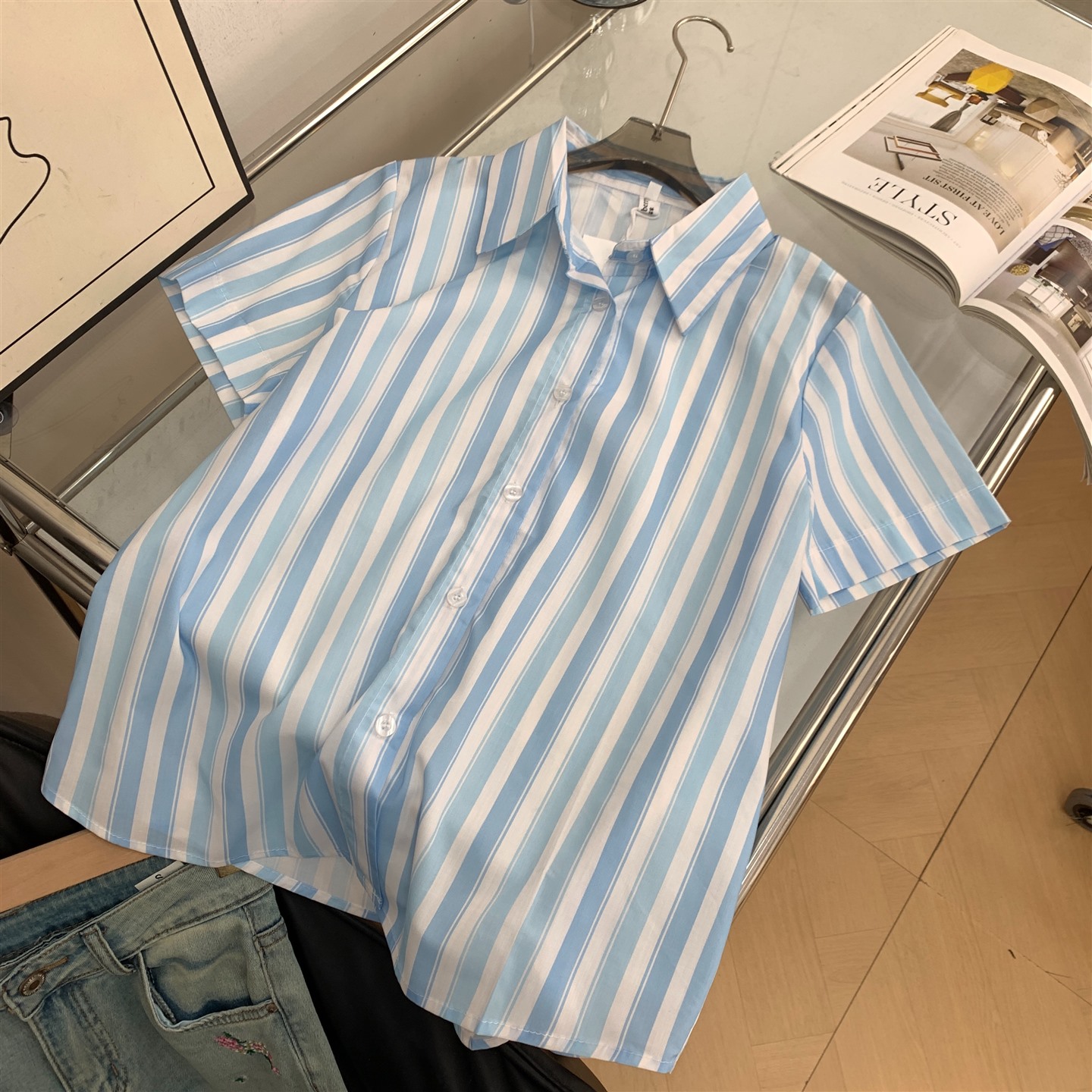 衬衫2025秋季新款宽松短袖上衣休闲条纹小众设计女I#30