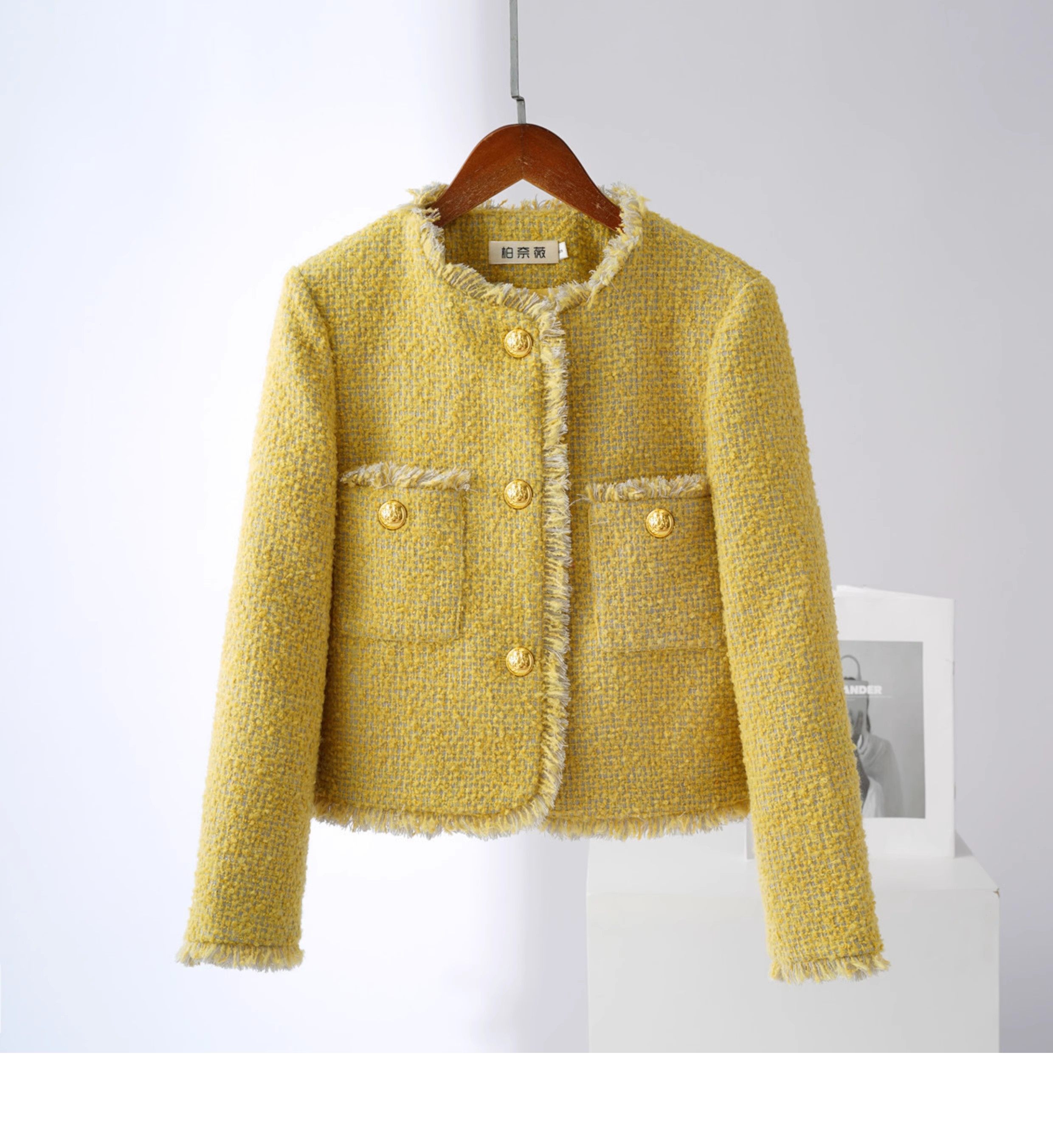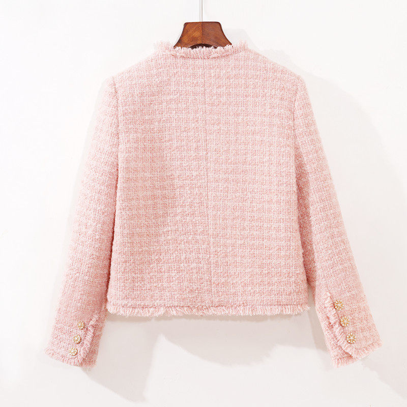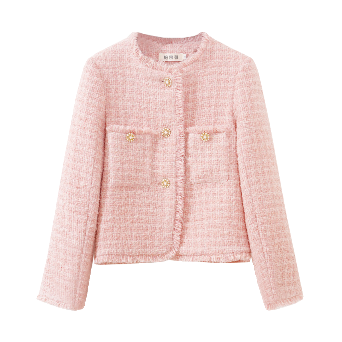 柏奈薇小香风浅粉色短外套女2024秋冬羊毛呢法式小个子流苏上衣