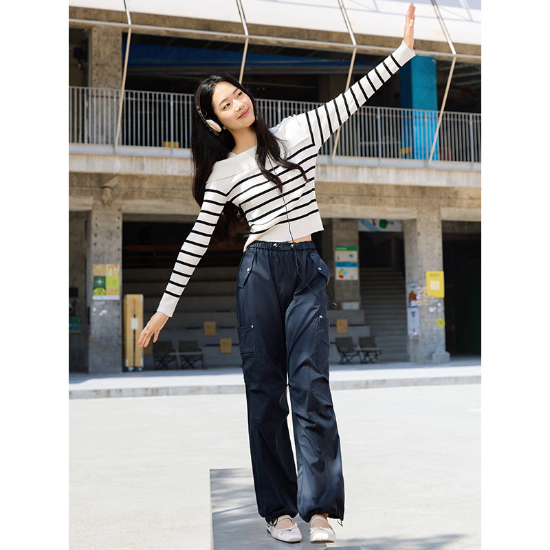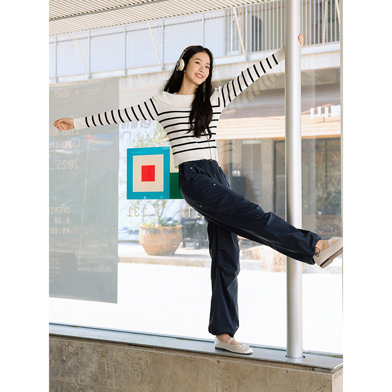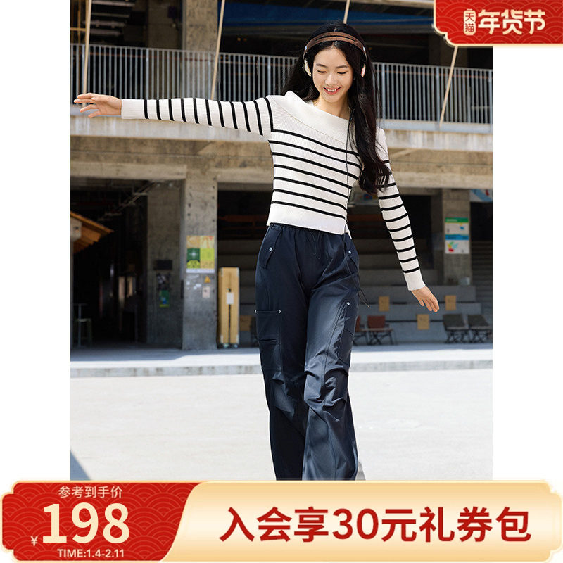 热风2025年秋季新款女士黑白条纹一字领荡领针织衫柔软舒适