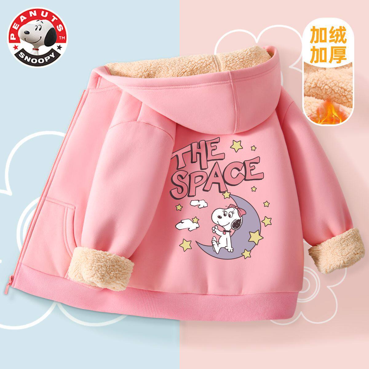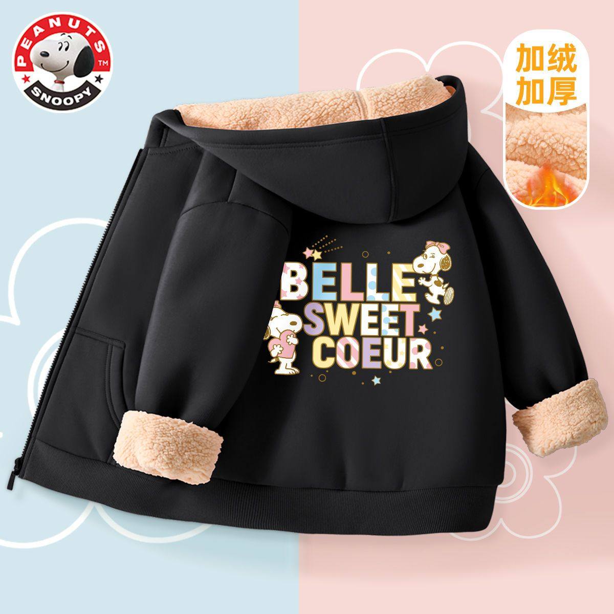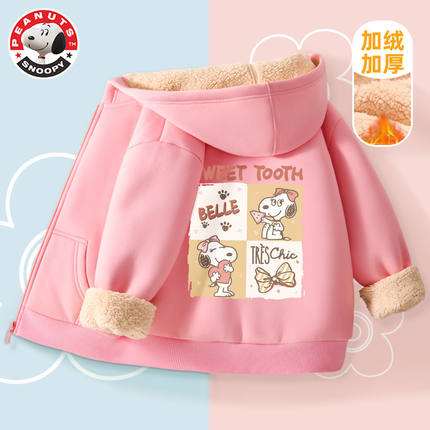 史努比女童加绒外套粉色时髦儿童开衫卫衣羊羔绒加厚小女孩冬装潮