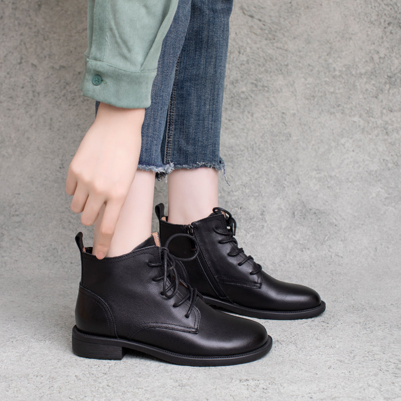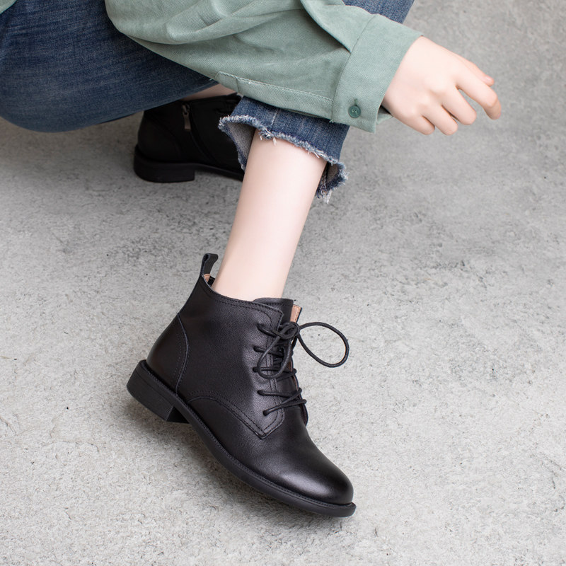 圆头马丁靴女秋冬新款真皮靴子侧拉链平跟高帮单靴舒适轻便时装靴