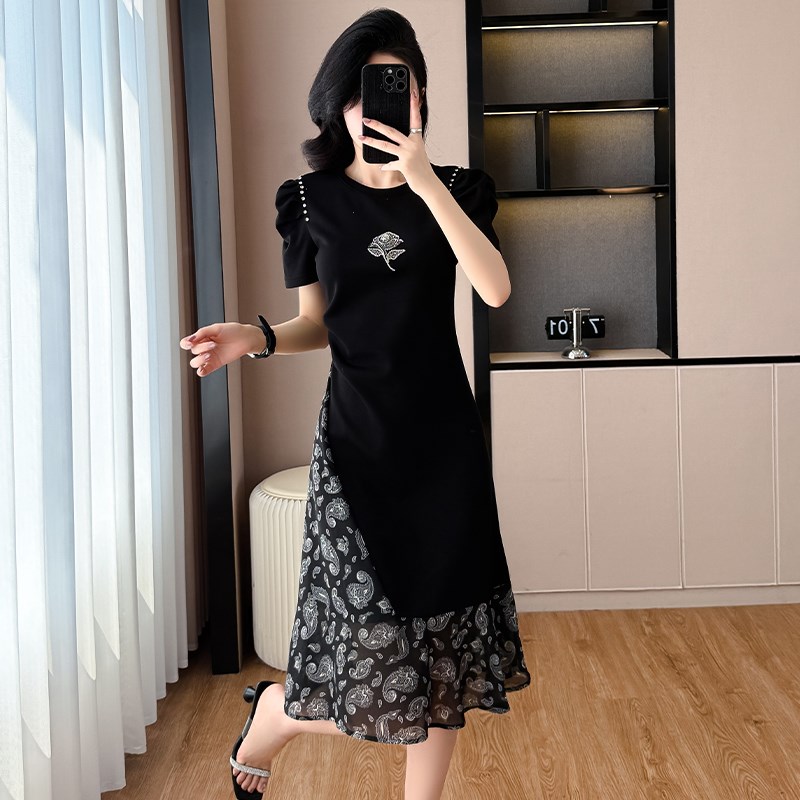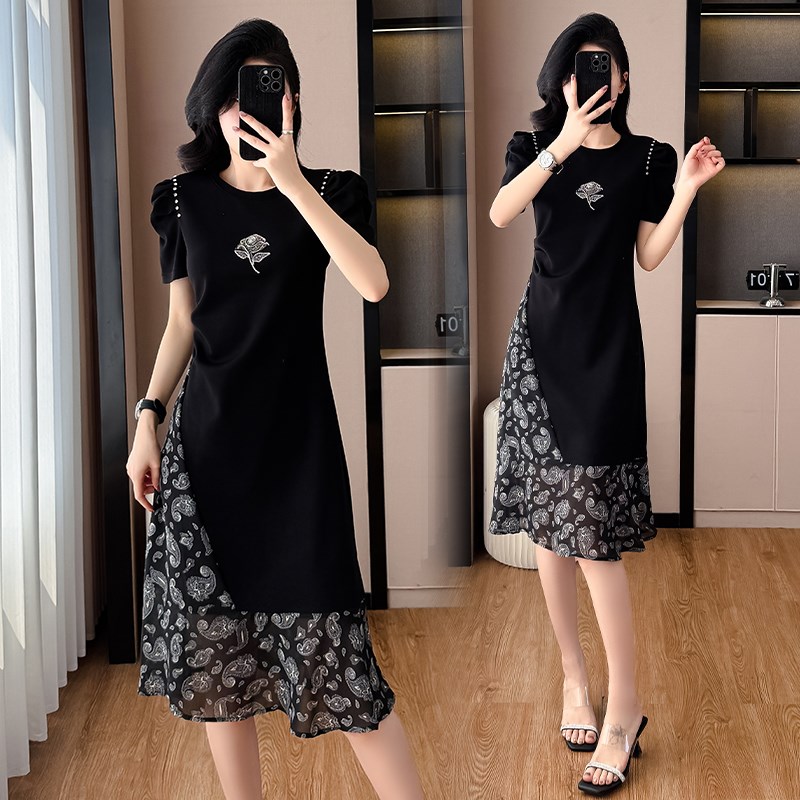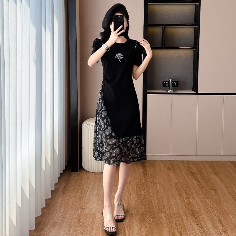 高级感轻奢连衣裙女夏季百搭气质收腰显瘦雪纺拼接设计感t恤裙子