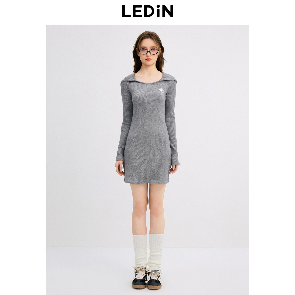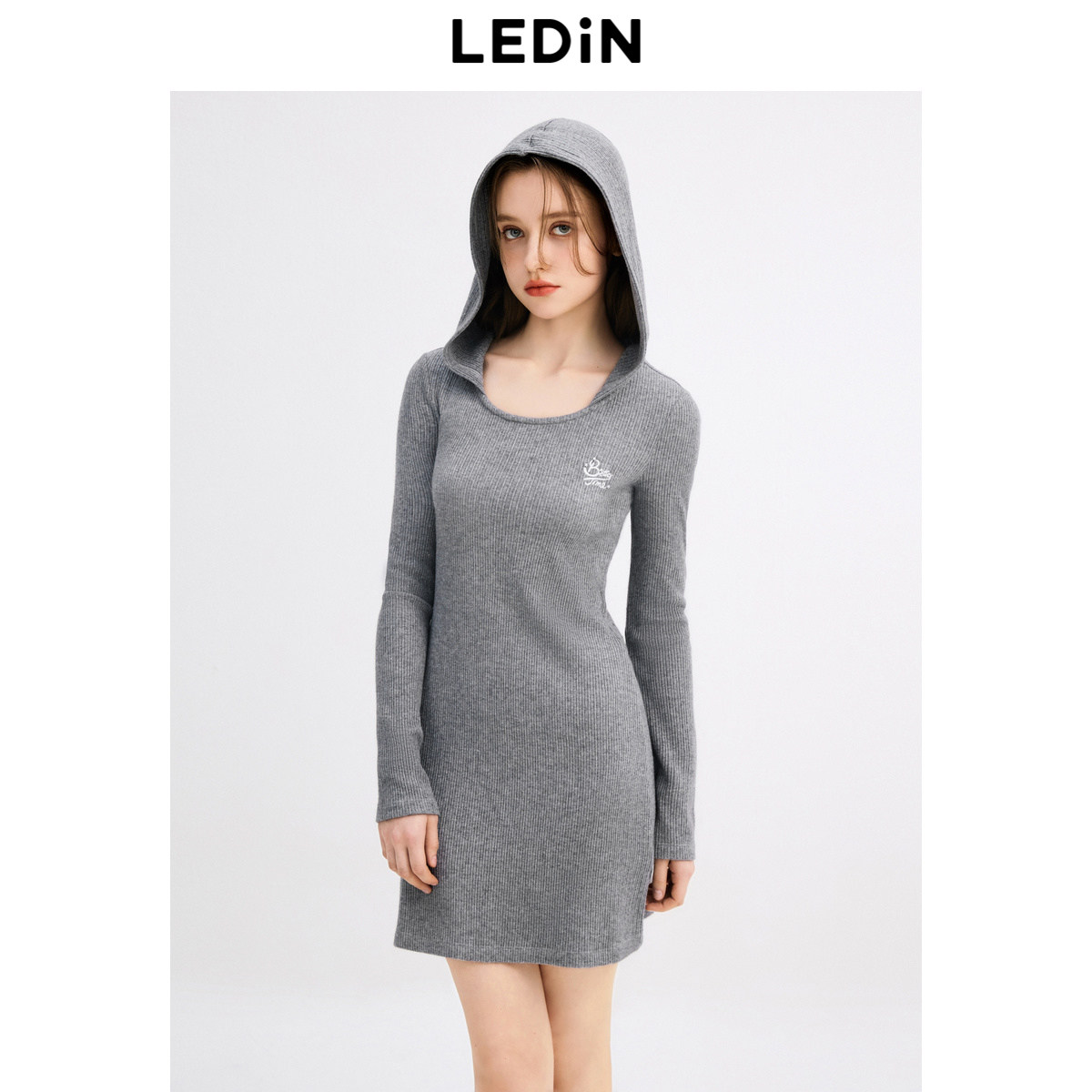 乐町针织连帽连衣裙年秋季新款精致刺绣格雷系学院风针织短裙