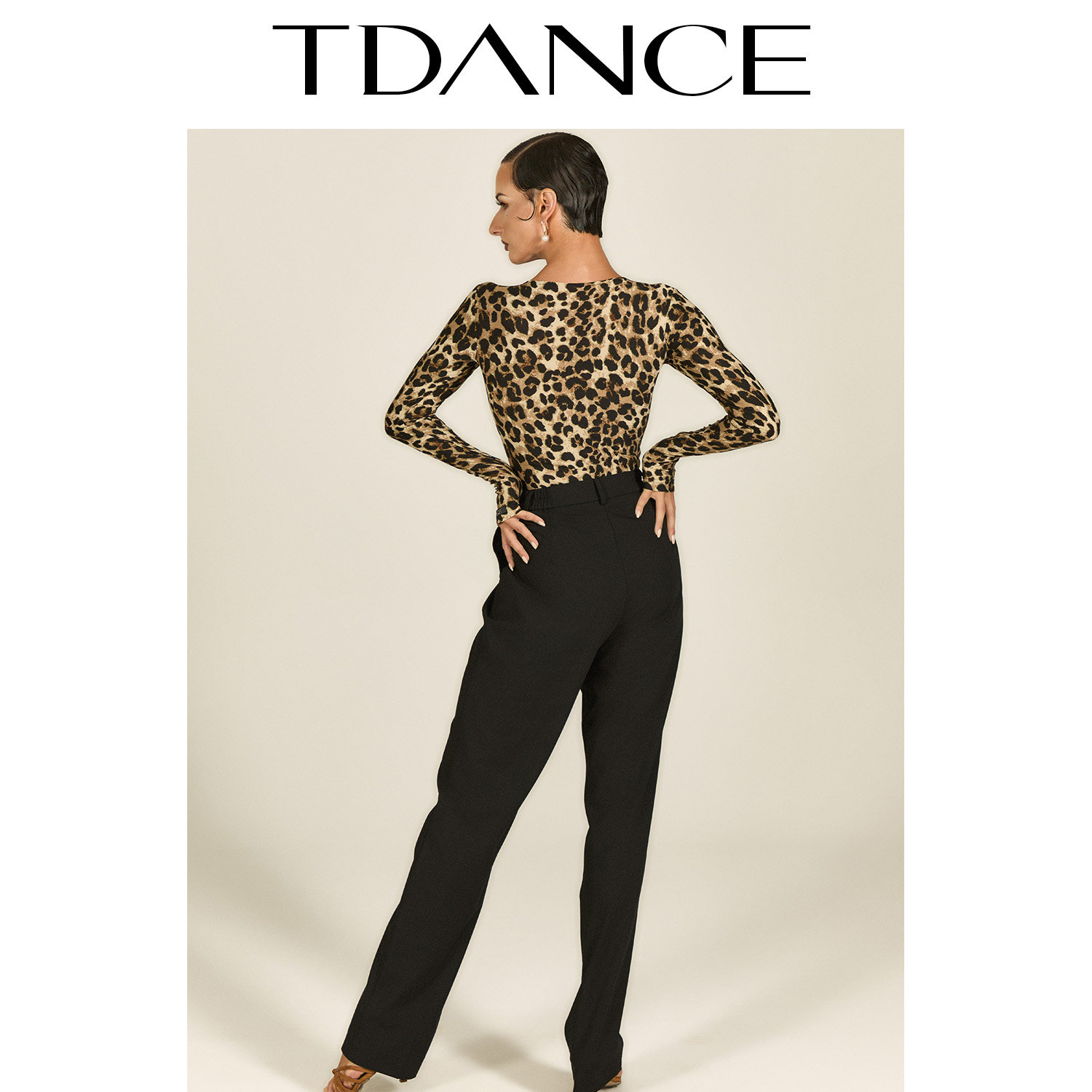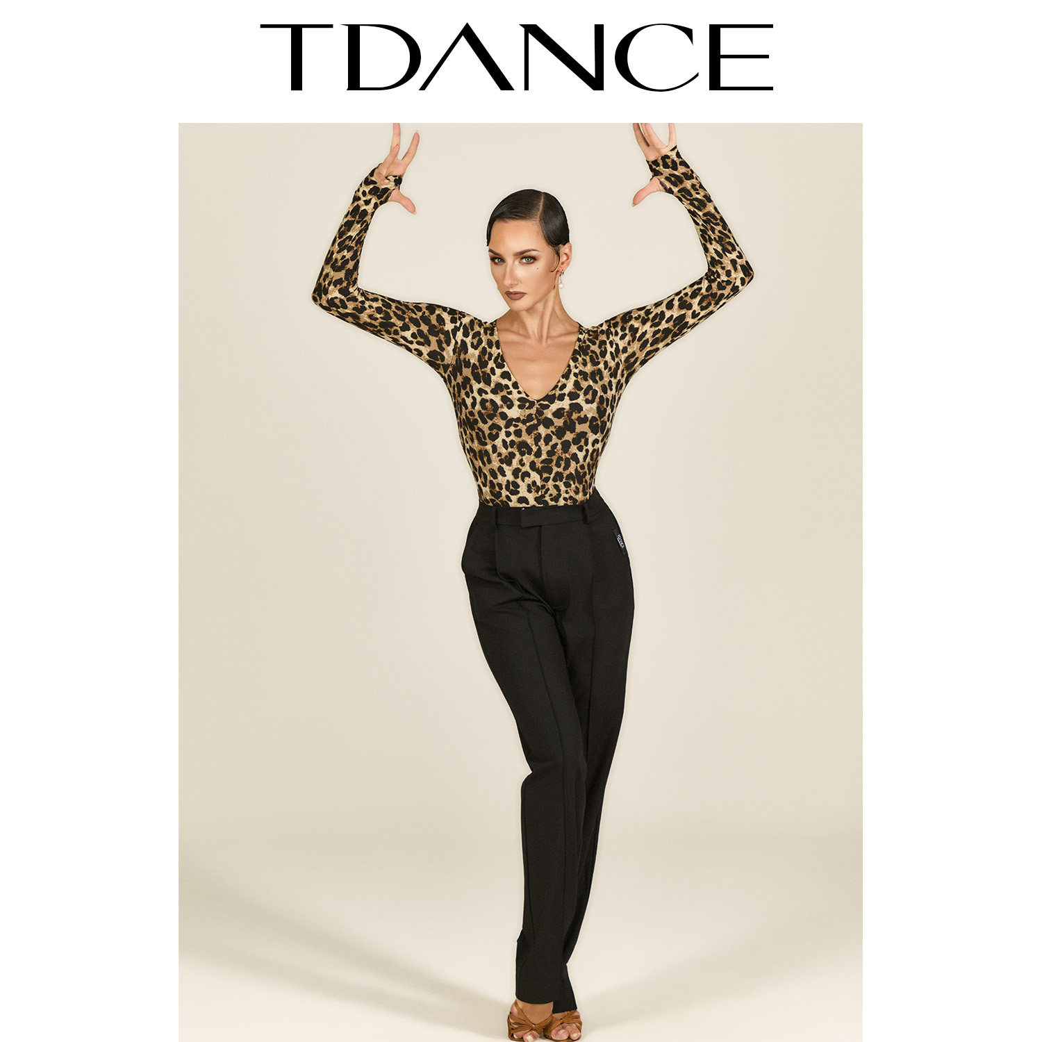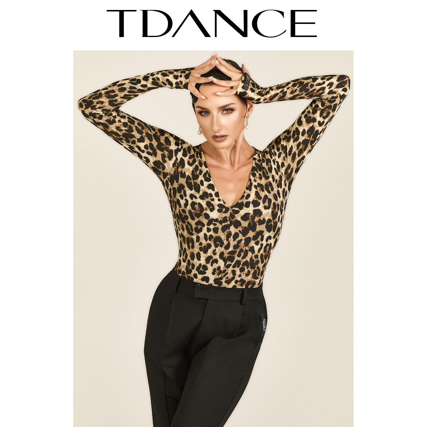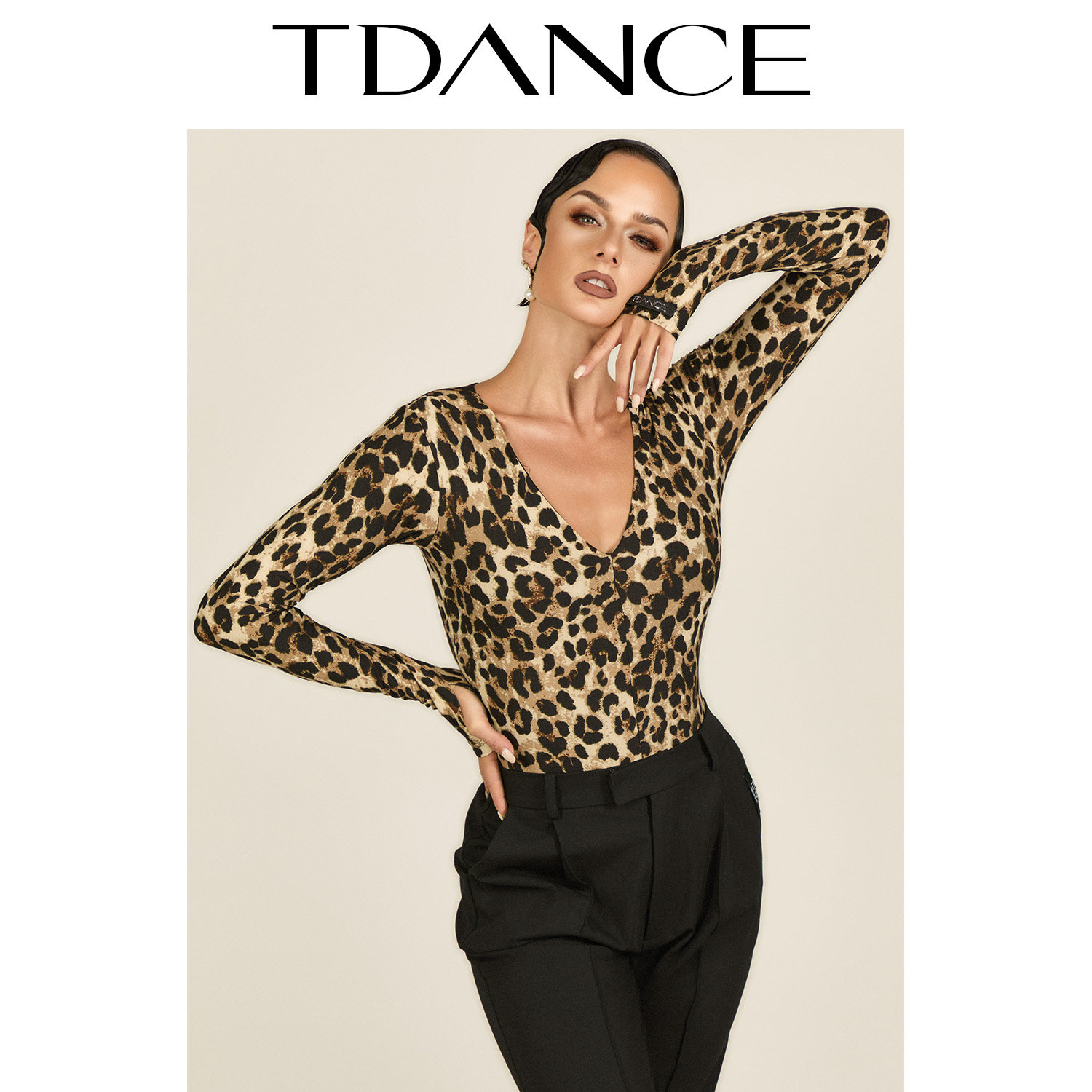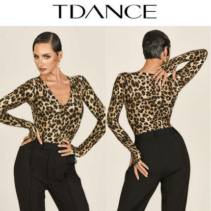 TDANCE拉丁摩登练习【豹纹V领长袖连体上衣】百搭秋冬日常GL-212