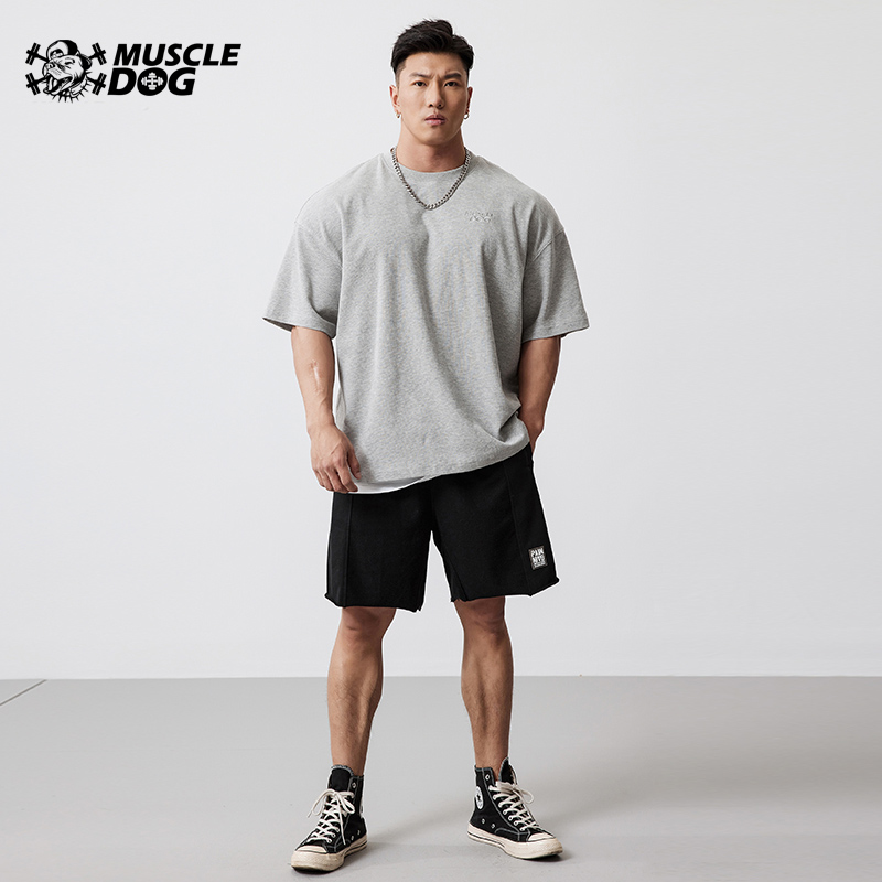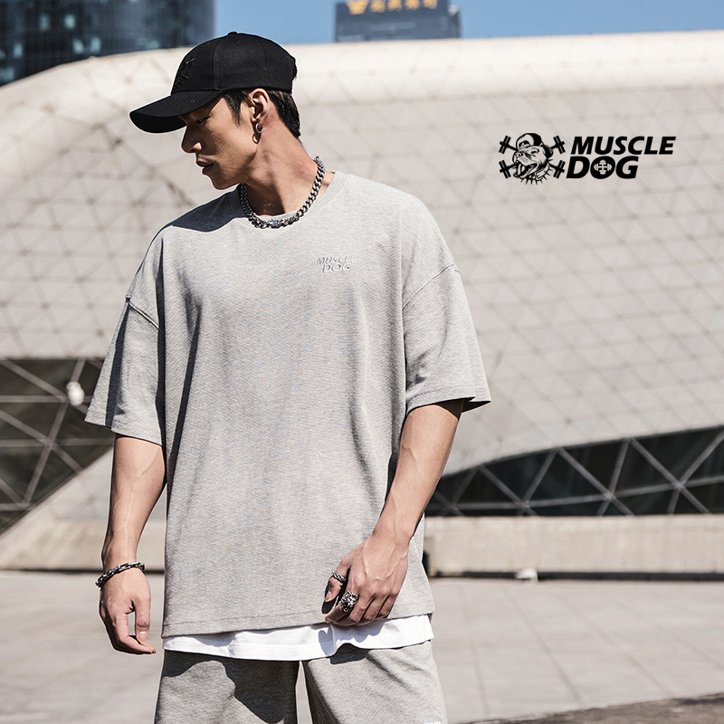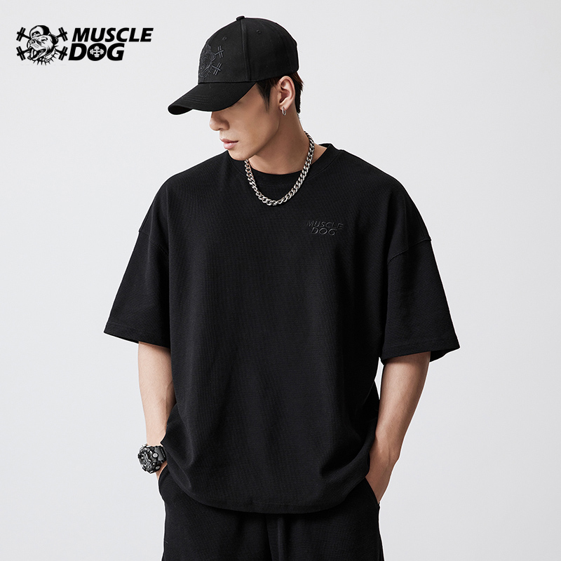 肌肉狗 潮牌华夫格套装运动休闲短袖T恤男宽松训练服健身上衣男士