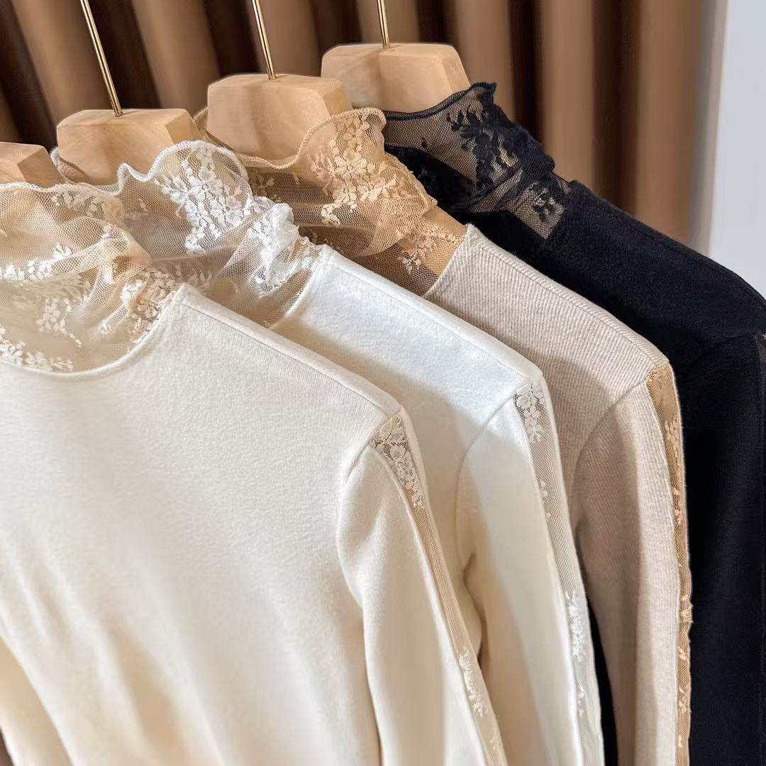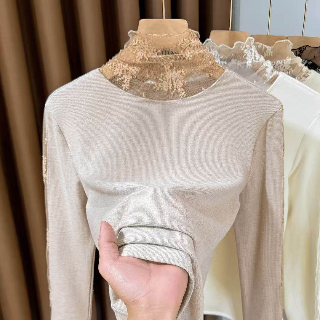 高级感高领磨毛蕾丝打底衫女秋冬新款加厚保暖牙签绒叠穿内搭小衫