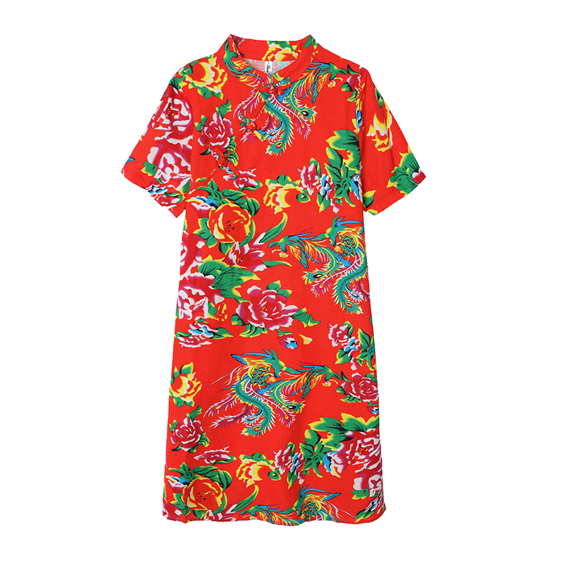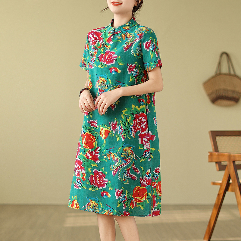 民族风东北花布复古棉麻短袖连衣裙女夏季大码宽松显瘦中长款旗袍
