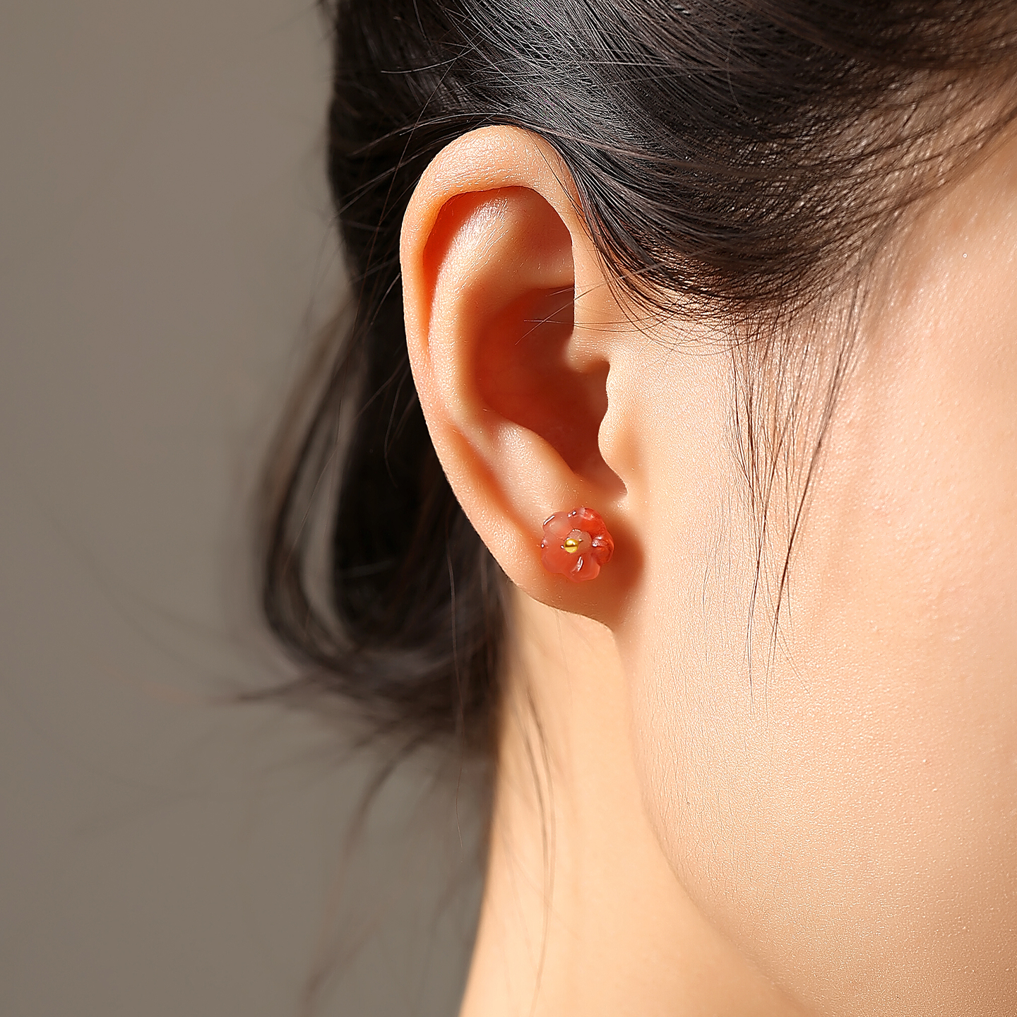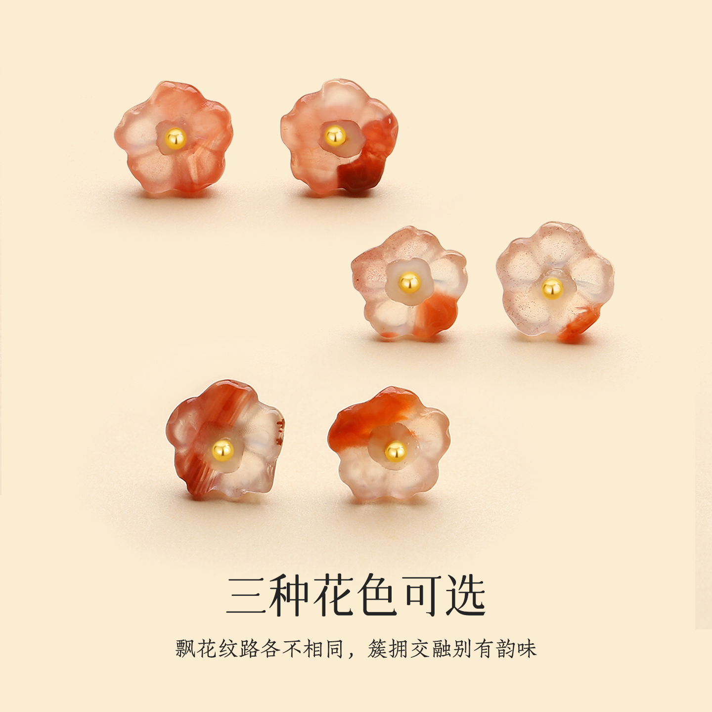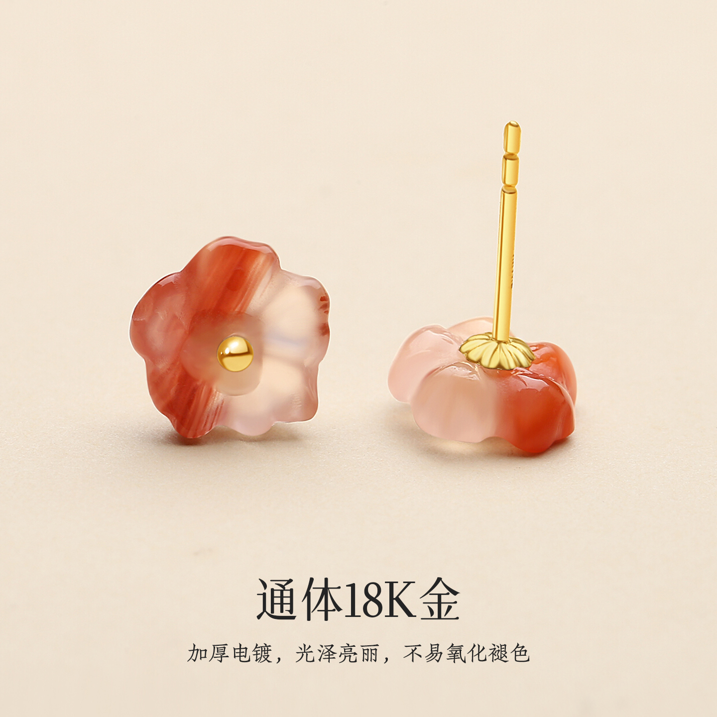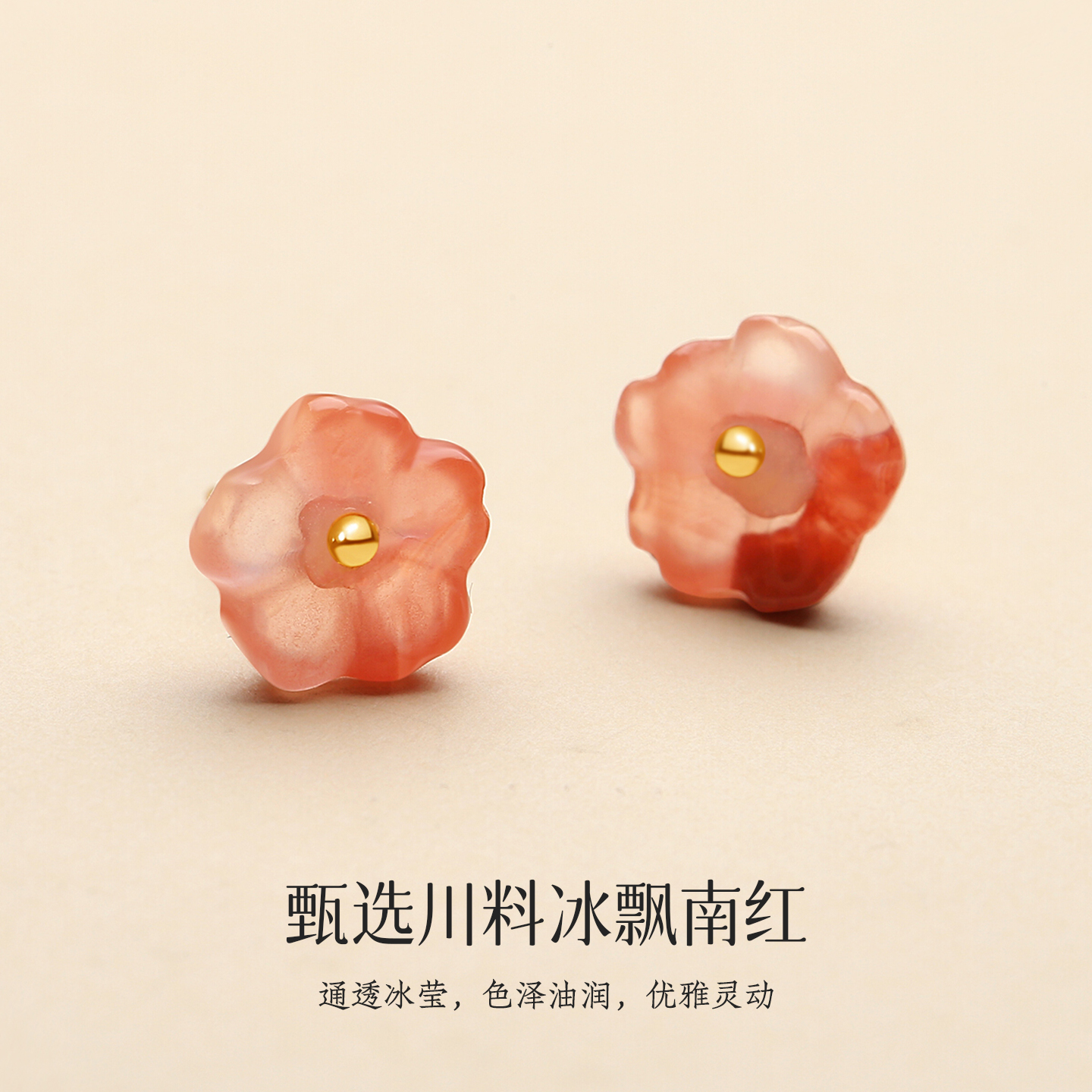天然原矿凉山南红玛瑙冰飘小桃花耳钉女18K金新中式清新森系耳饰