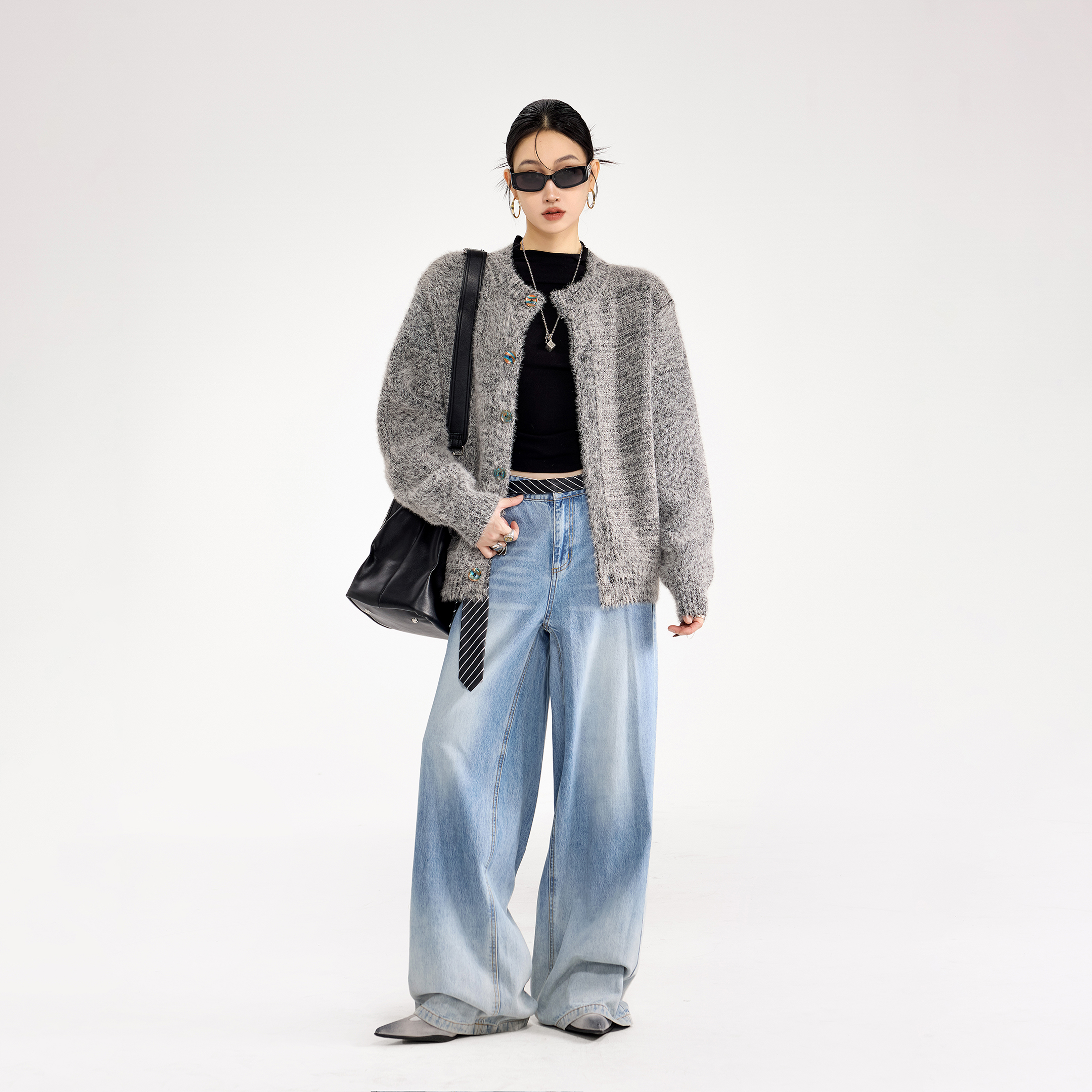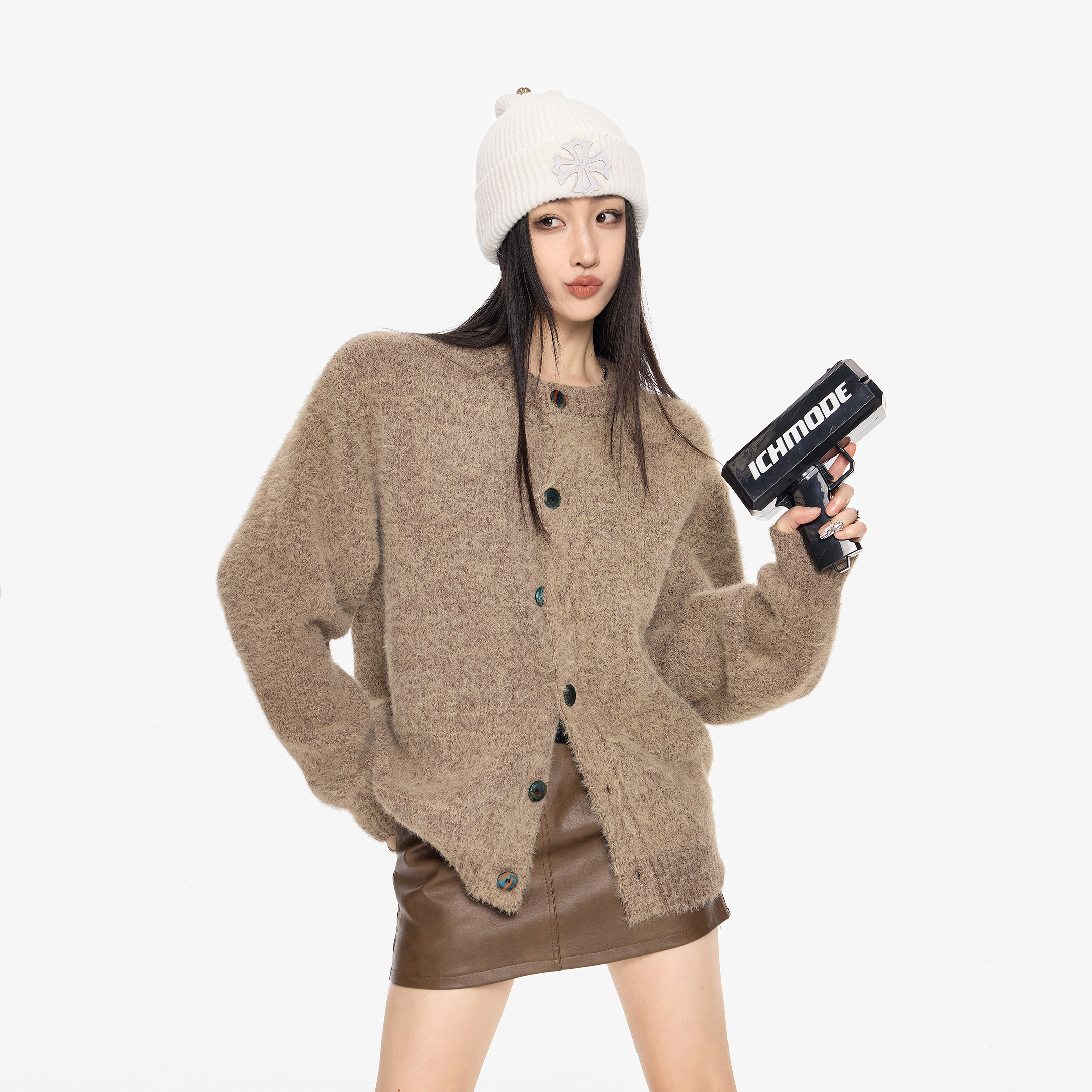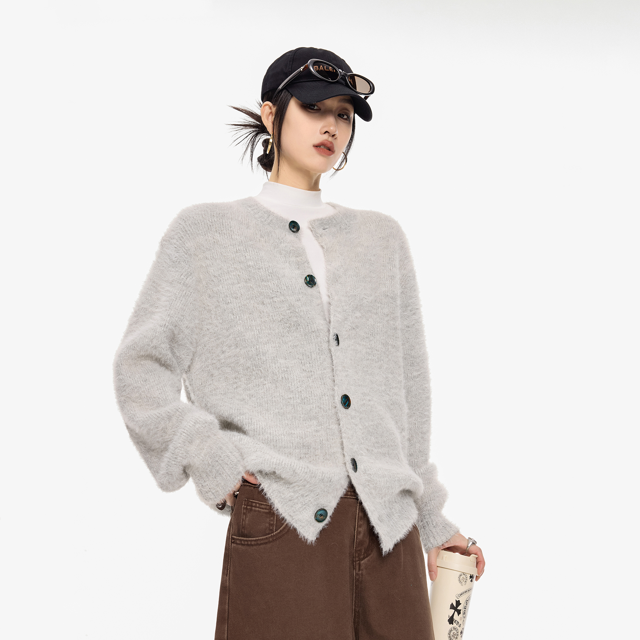 ICHMODE 美式复古貂毛针织衫开衫女秋冬季慵懒风短款灰色毛衣外套