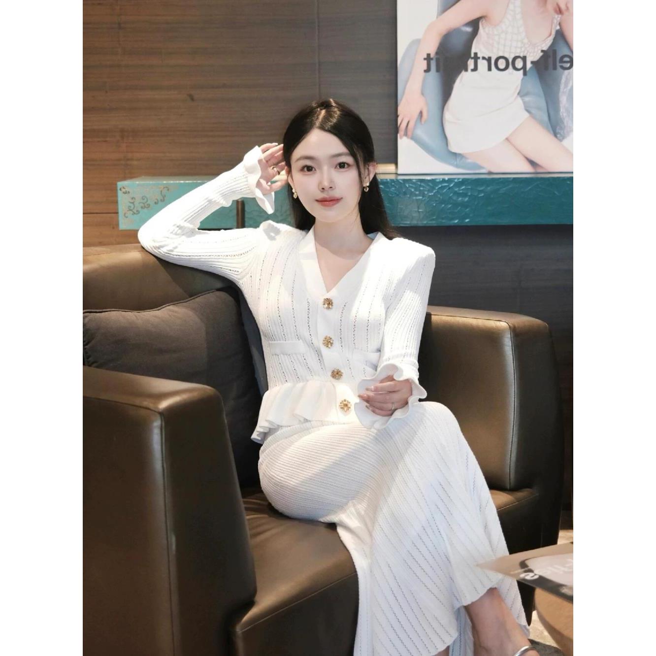 重工织造精致名媛法式镂空V领气质荷叶边针织假两件连衣裙早秋季