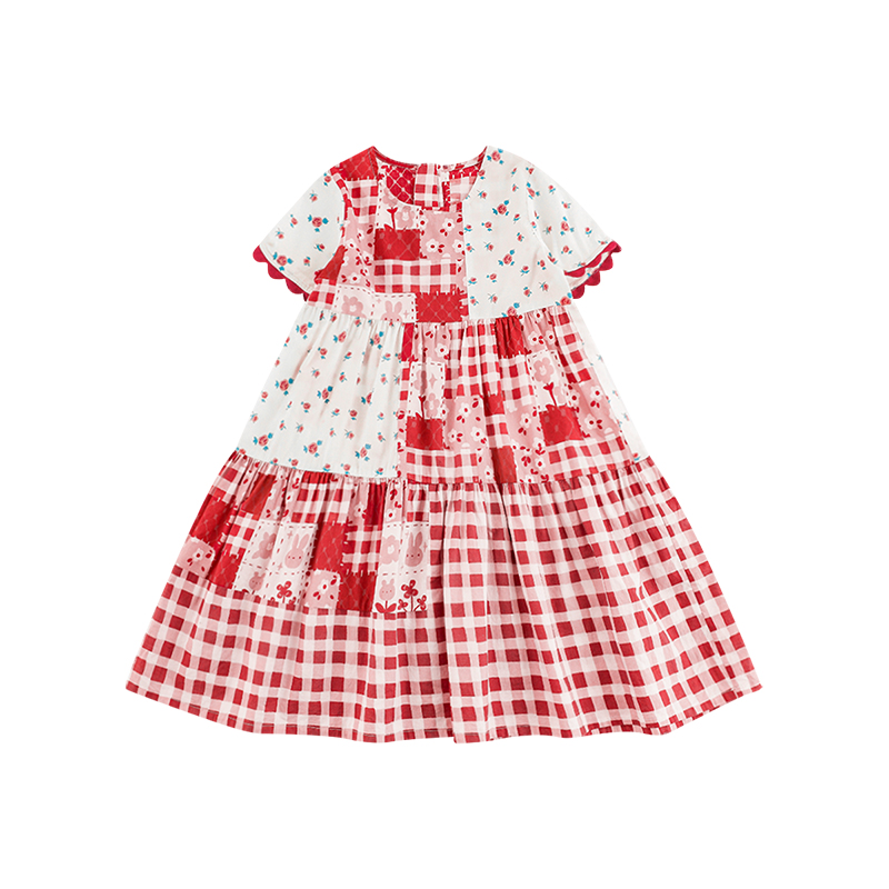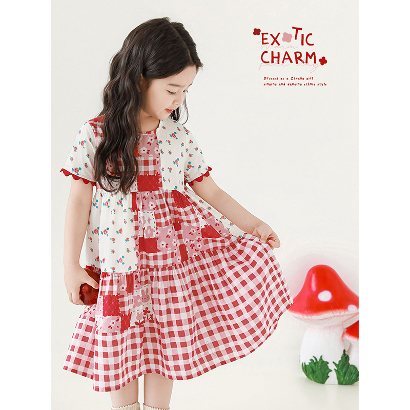 幼悠 女童碎花格纹印花A字连衣裙2025夏季红色织带拼接袖口裙子潮