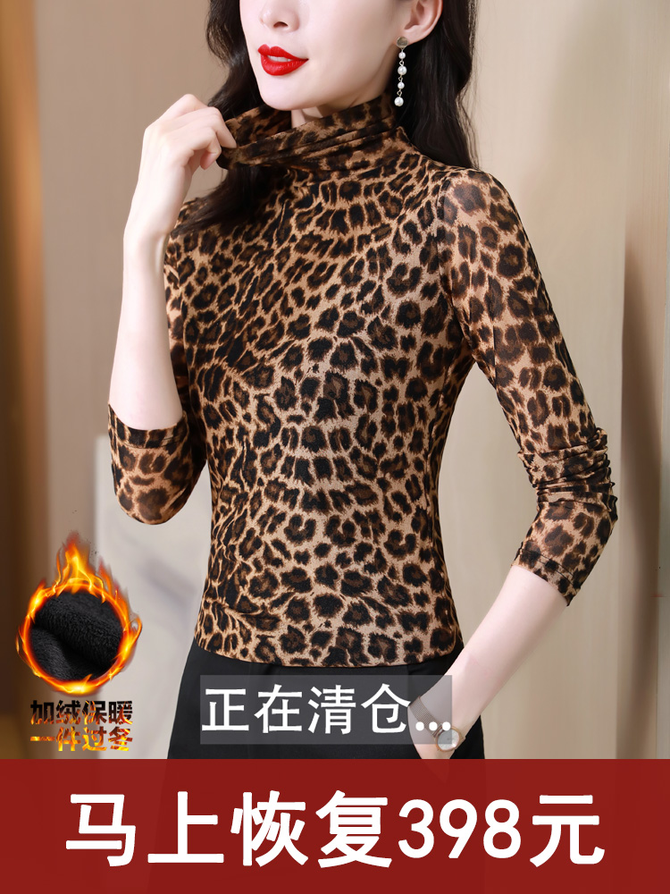 豹纹高领网纱长袖上衣女秋冬加绒加厚印花打底衫弹力大码内搭上衣