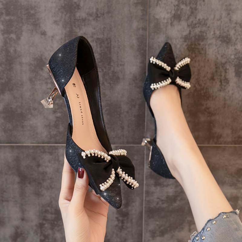 高跟鞋女2025年新款春秋韩版中空法式少女尖头珍珠蝴蝶结细跟单鞋