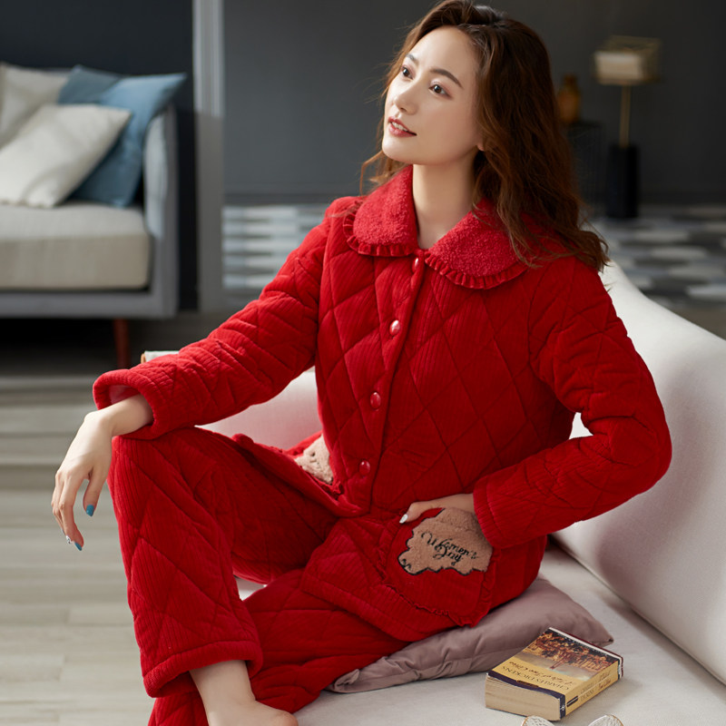 圆人珊瑚绒睡衣女士冬款加厚加绒夹棉红色结婚秋冬大码家居服套装