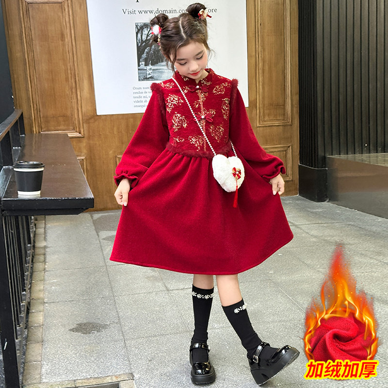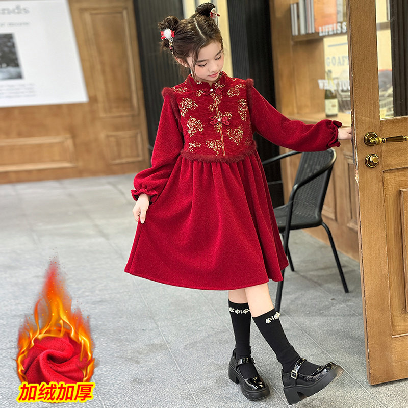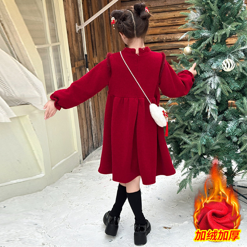儿童装女童冬装加绒红色连衣裙2025新款中大童女孩冬季加厚拜年服