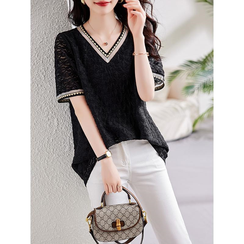 胖妹妹300斤宽松遮肉洋气慵懒风中长款V领特大码夏季女装短袖上衣