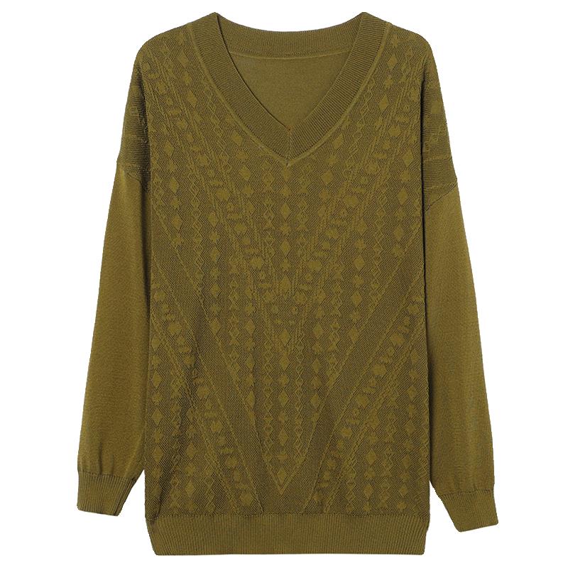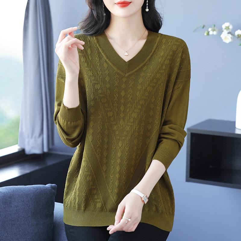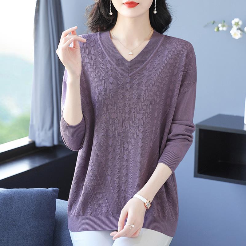 冰丝针织衫V领长袖上衣女春季新款妈妈宽松加大码薄款洋气打底衫