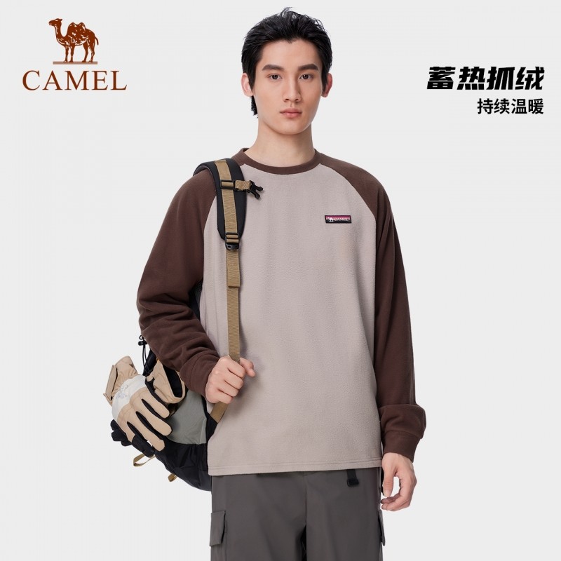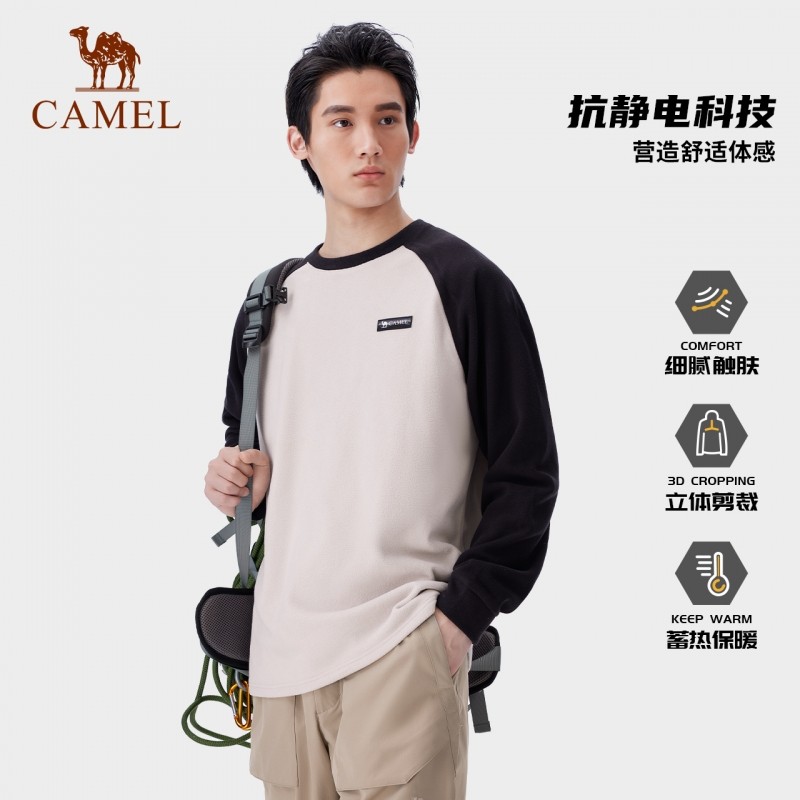 骆驼户外抓绒衣男内搭秋冬长袖T恤220g轻量聚热保暖衣加绒打底衫