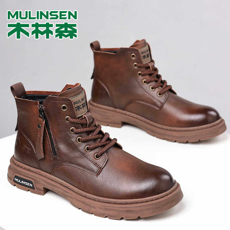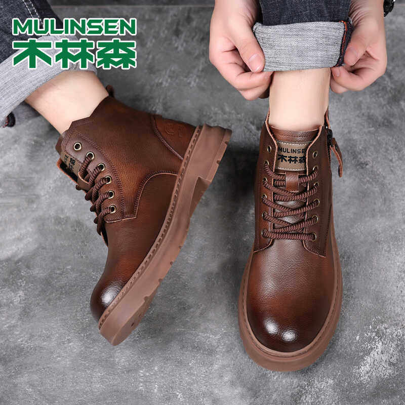 木林森马丁靴男秋冬新款真皮高帮休闲皮鞋男士加绒英伦复古工装靴