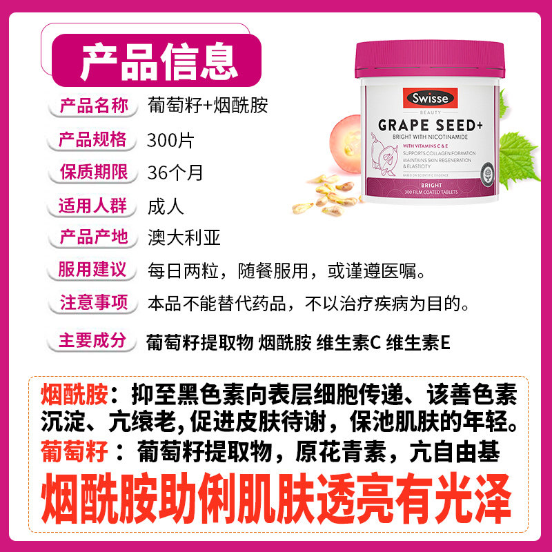 澳洲Swisse葡萄籽烟酰胺300粒花青素精华焕白胶原蛋白