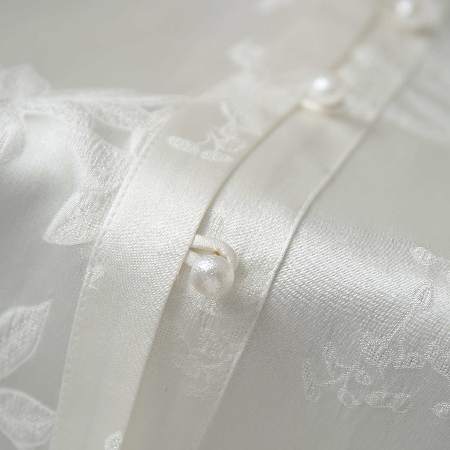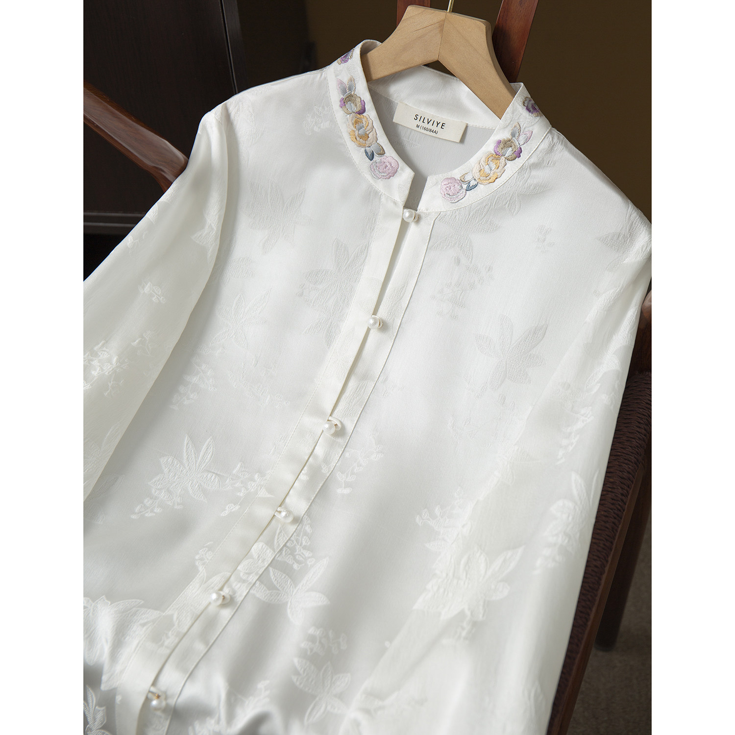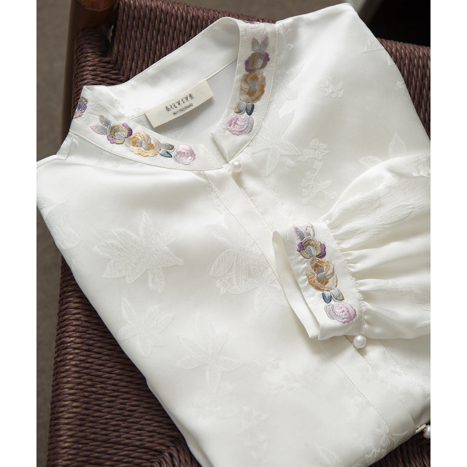 丝艺100%桑蚕丝立领精致刺绣真丝花萝冠乐绉提花衬衫珍珠扣衬衣春