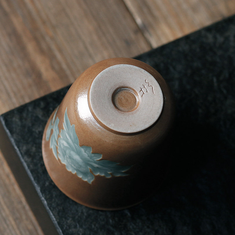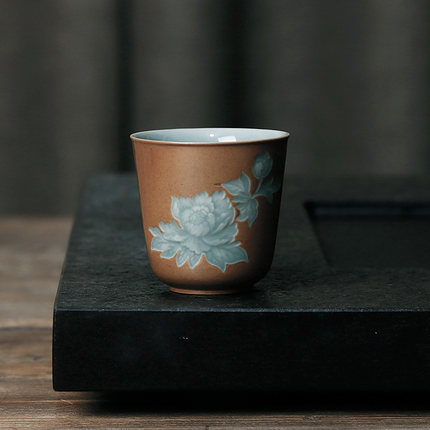龙泉窑唐宫青瓷高端双色釉手工中式草木灰釉牡丹闻香杯主人杯茶杯