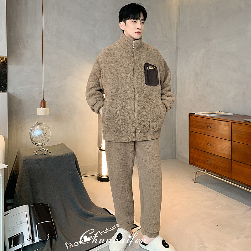 新款睡衣男秋冬季长袖加厚保暖羊羔绒家居服可外穿套装加大码居家