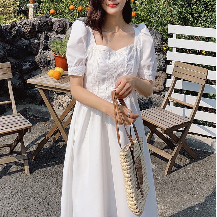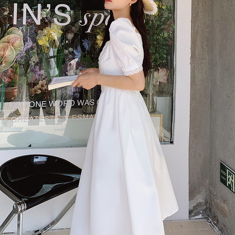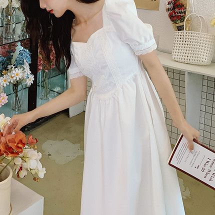 新中式白色方领泡泡袖法式浪漫甜美风显瘦气质连衣裙女高级感裙子