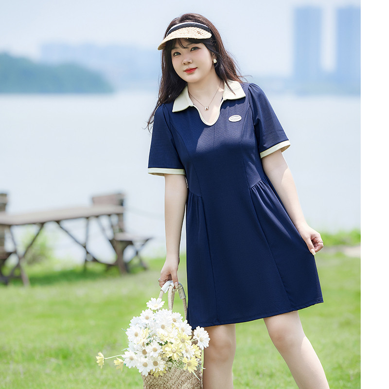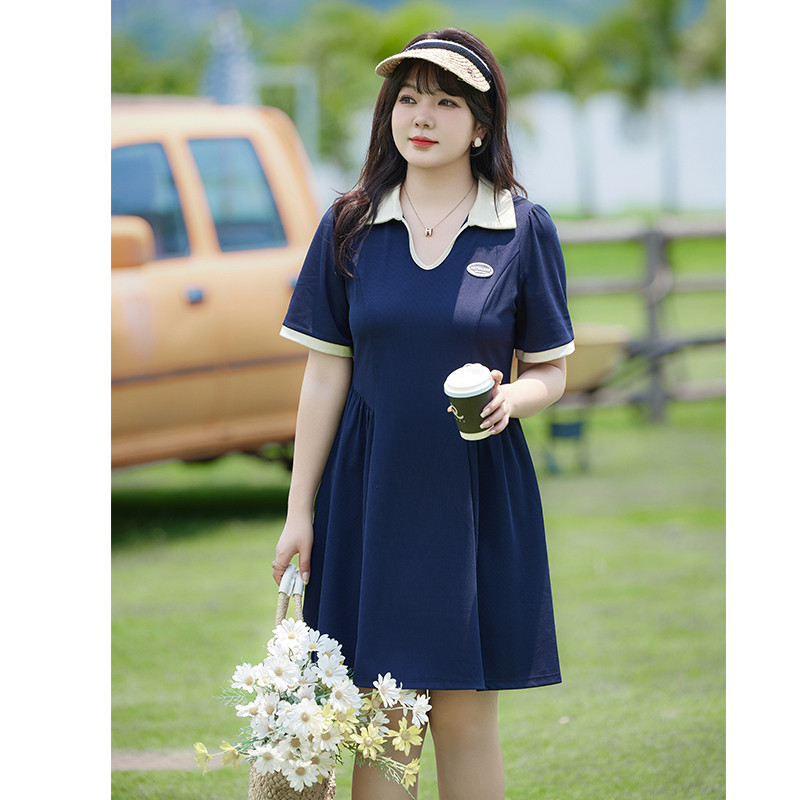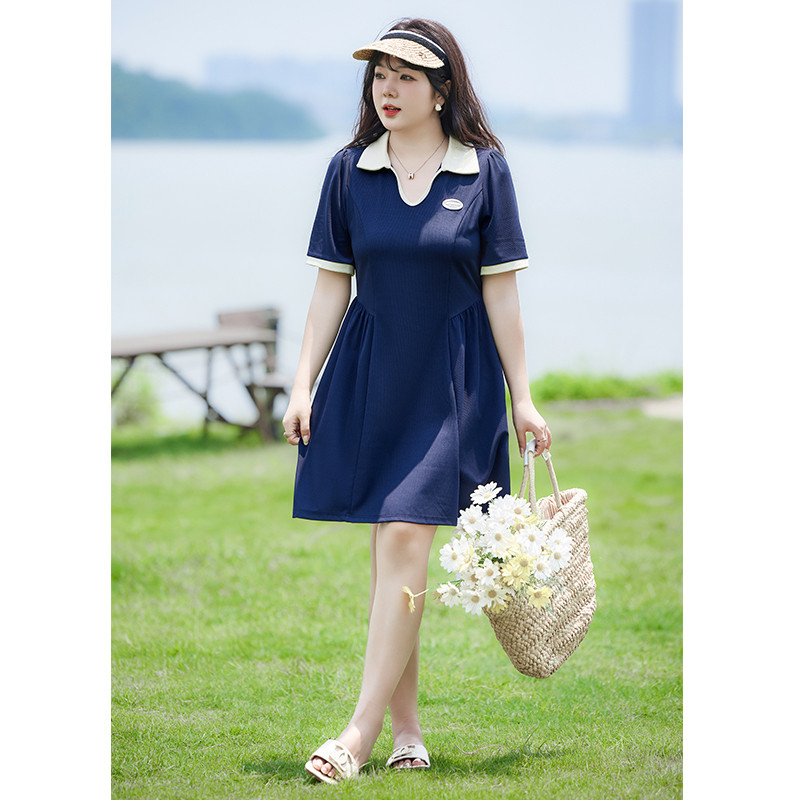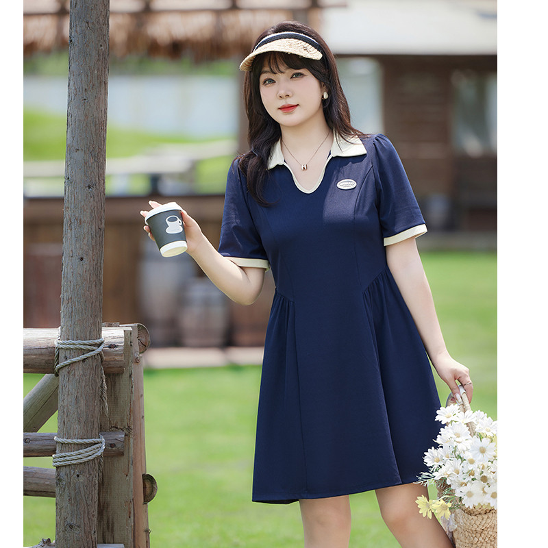 大码女装夏装新款气质polo领短袖裙子收腰显瘦胖mm遮肚子连衣裙