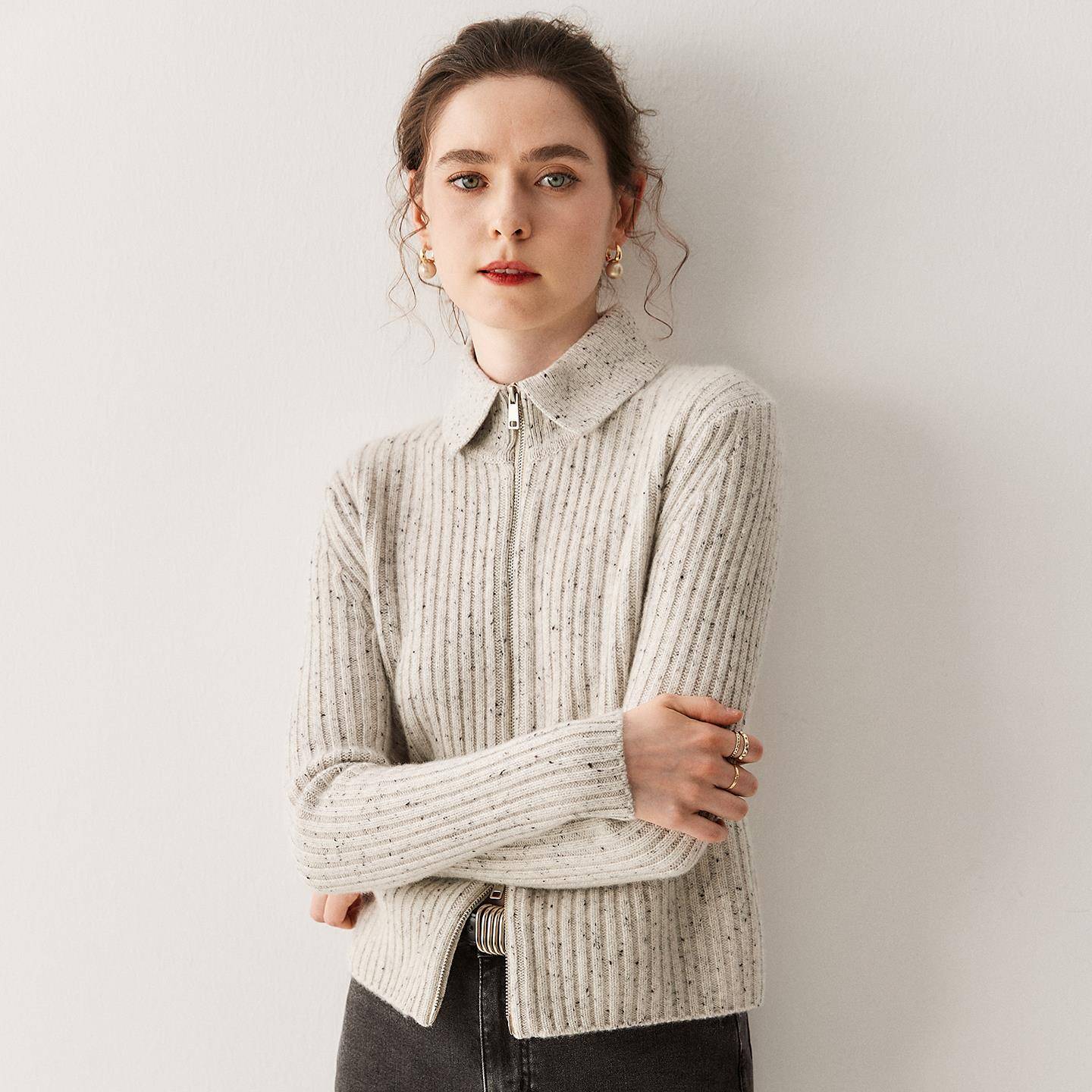 极简风高克重彩点山羊绒针织开衫女双拉链polo领修身毛衣外套