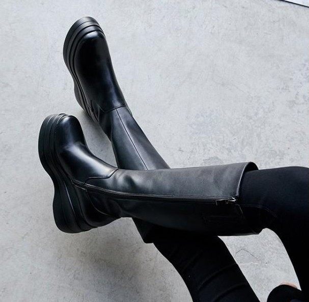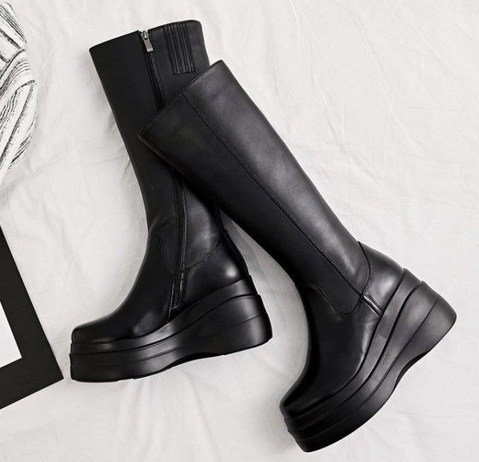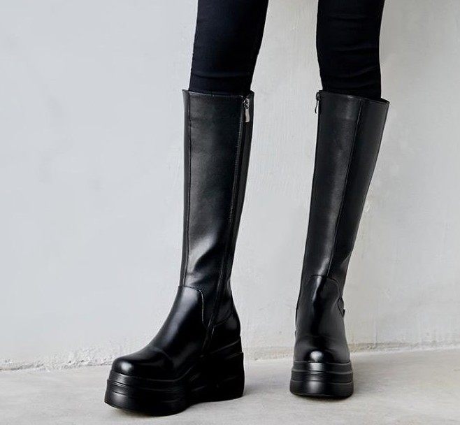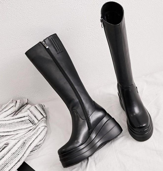 欧版高坡跟松糕厚底高筒马丁长靴隐形内增高真皮骑士女靴跟高11CM