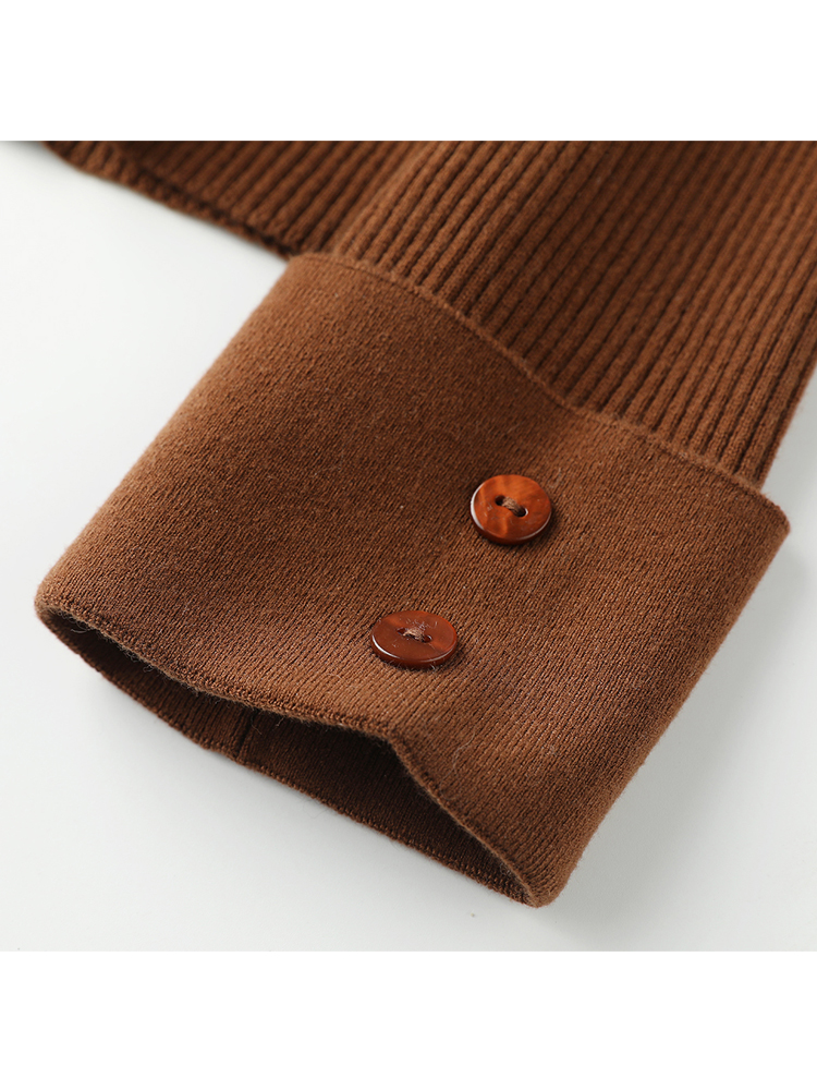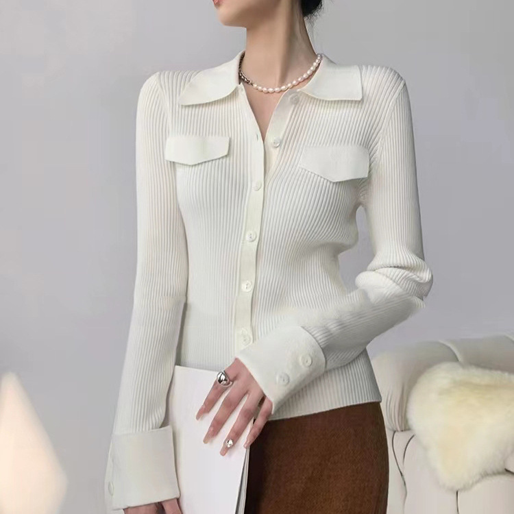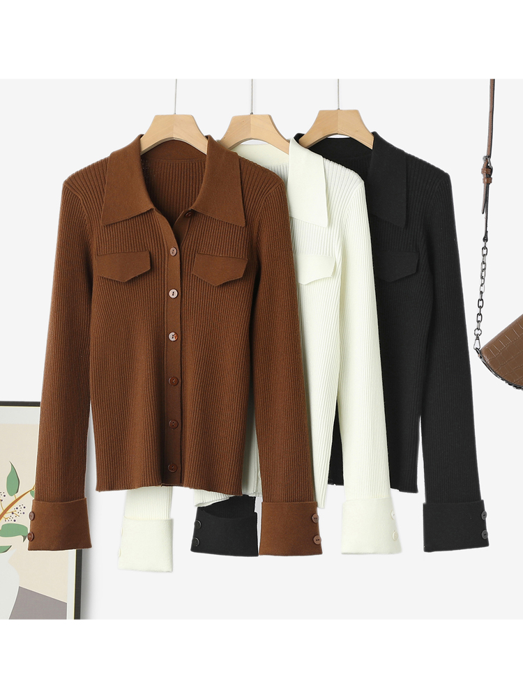 衬衫款羊毛显瘦竖坑条针织毛衣简约纯色修身弹力盖袋翻领开衫新款