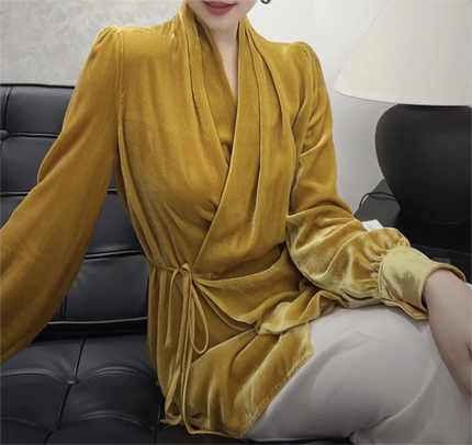 高端桑蚕丝丝绒外套女2024春季新款法式气质系带围裹V领衬衫上衣