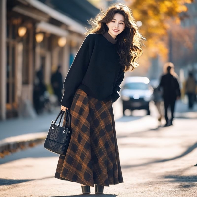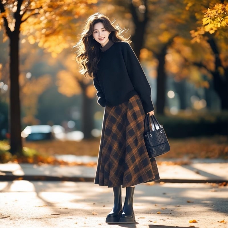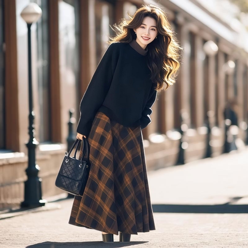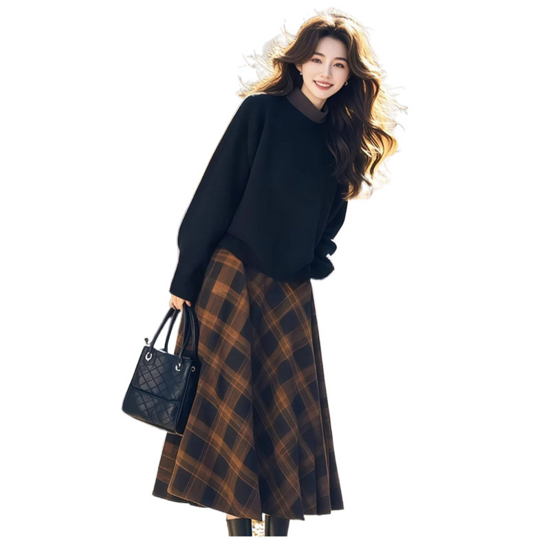 入冬搭配一整套2025新款小香风名媛撞色毛衣格子半身裙减龄套装