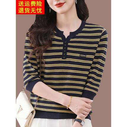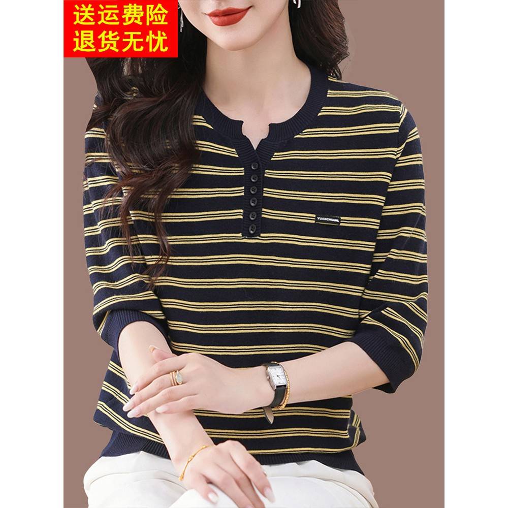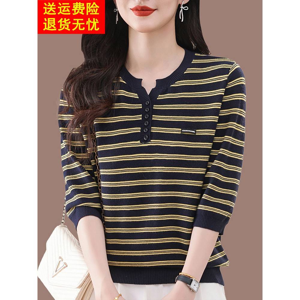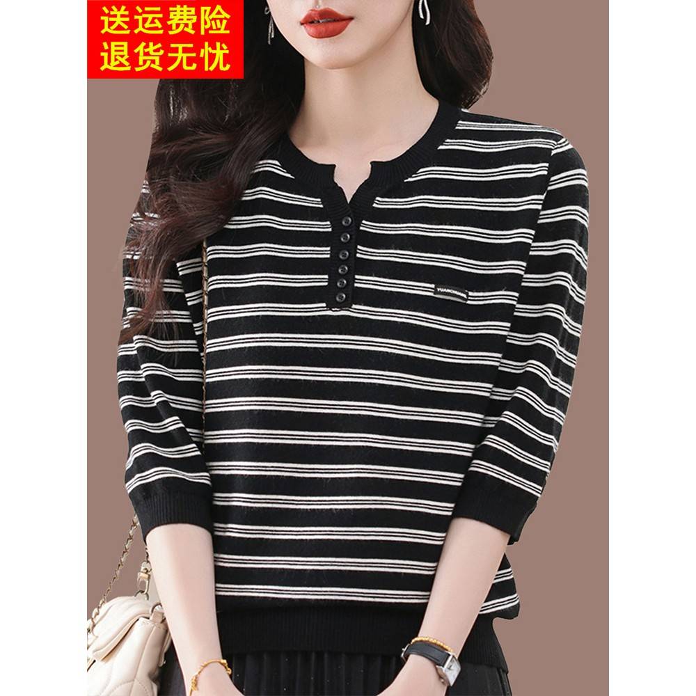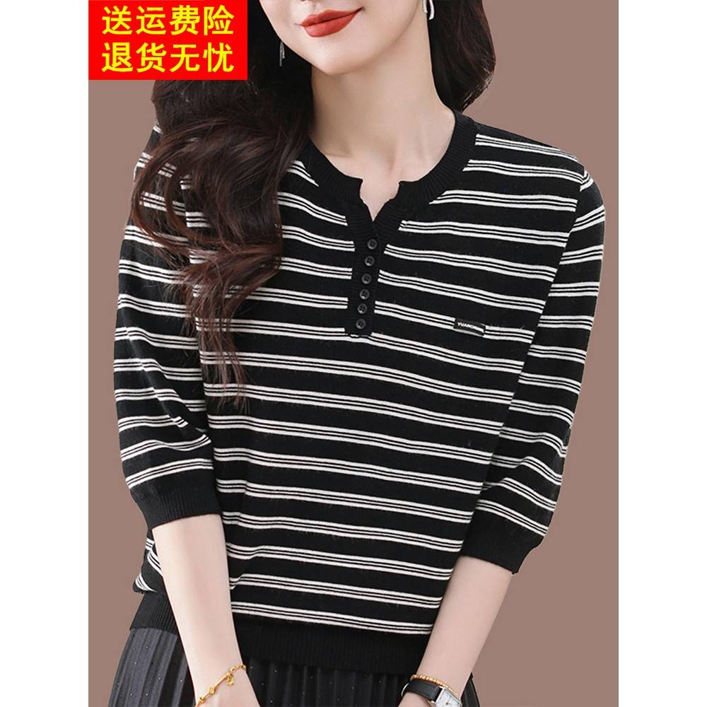 条纹薄款七分袖针织衫女妈妈新款秋季洋气宽松桑蚕丝打底上衣t恤