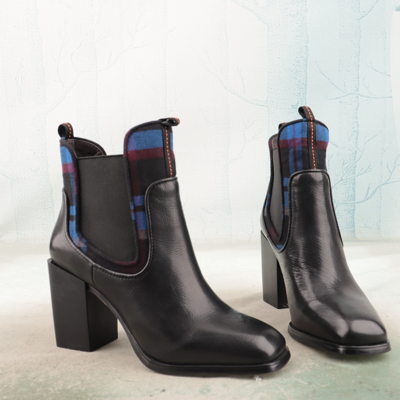 胎牛皮真皮拼色格纹布方头超高跟女鞋子女靴子短筒时装靴X109-2