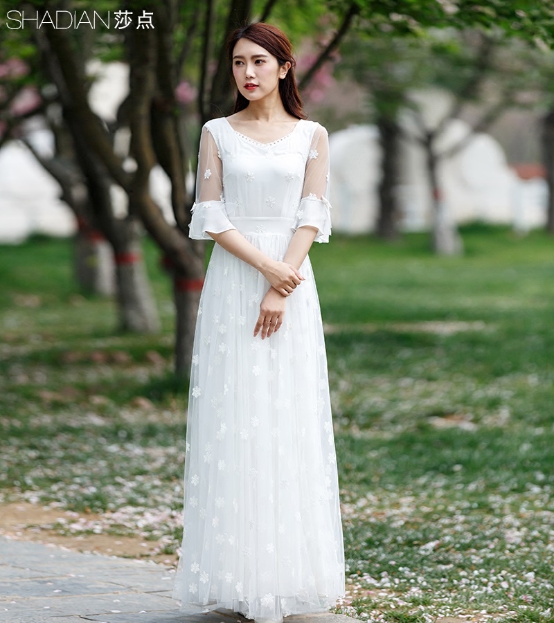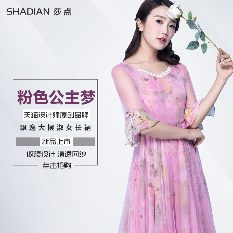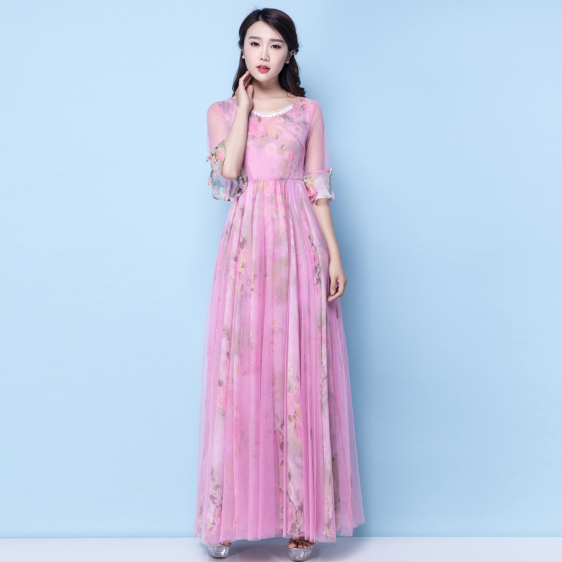 莎点高档小碎花复古雪纺连衣裙中袖长款夏高腰显瘦超仙女公主长裙