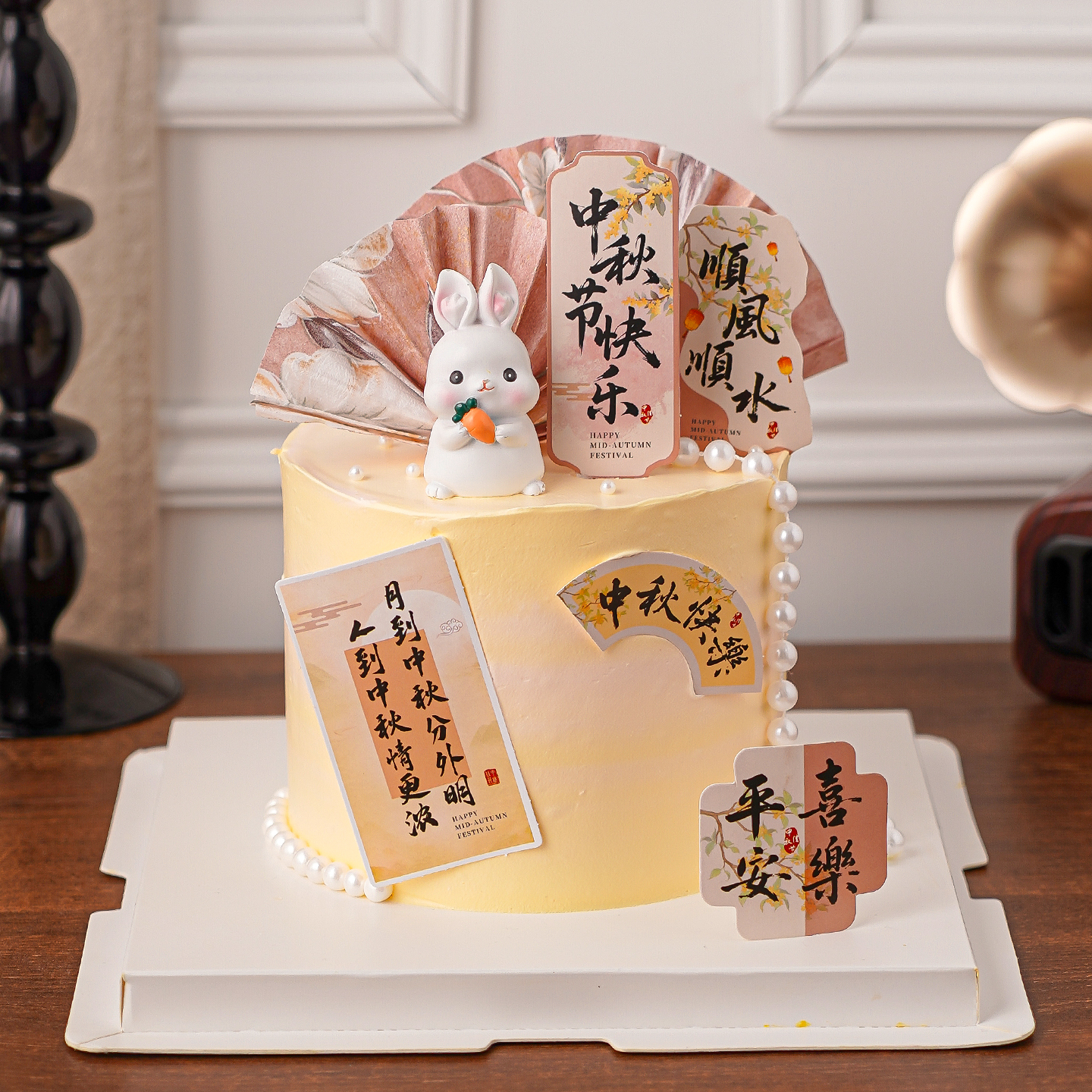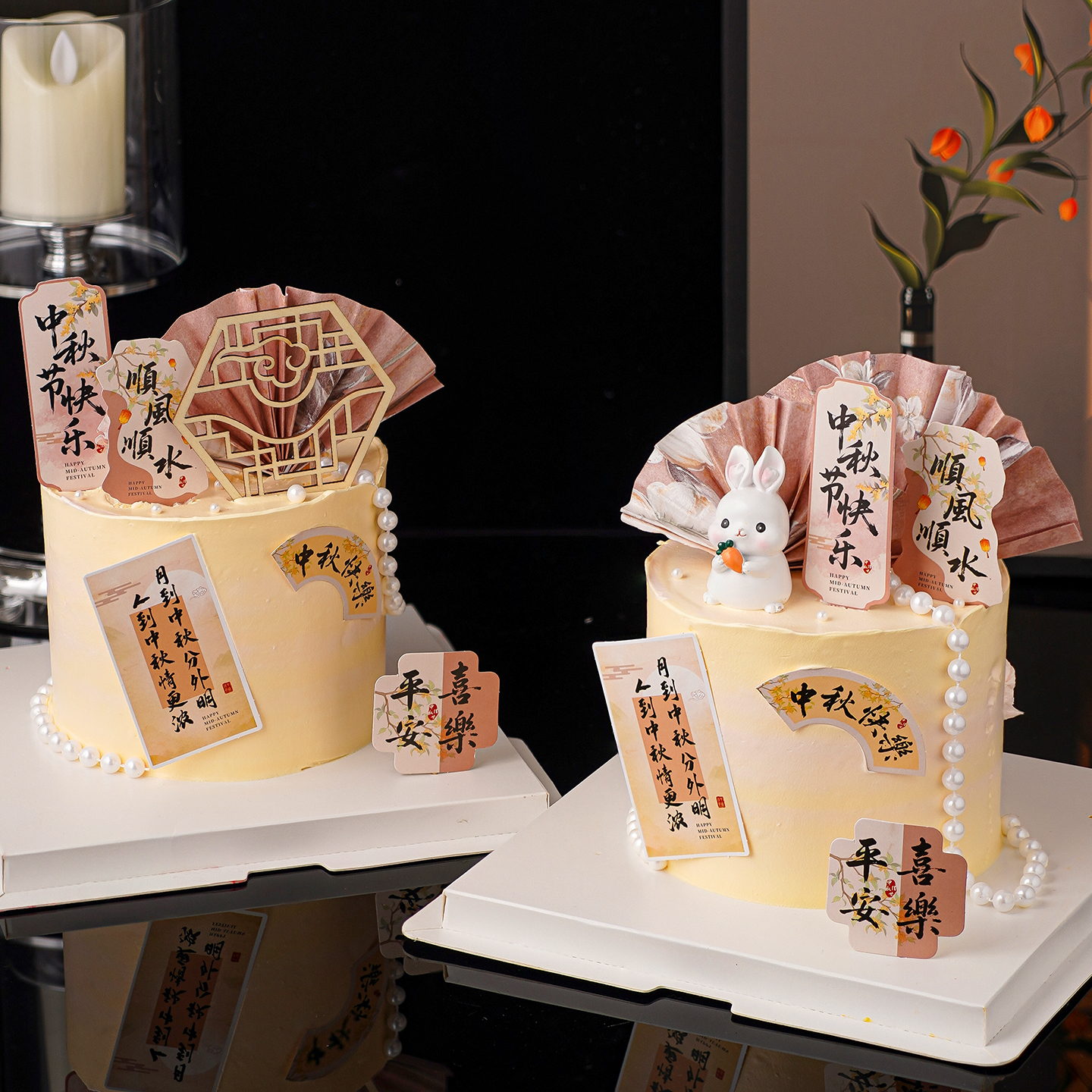 新中式中秋节快乐蛋糕装饰插牌可爱兔子摆件平安喜乐祝福语插件