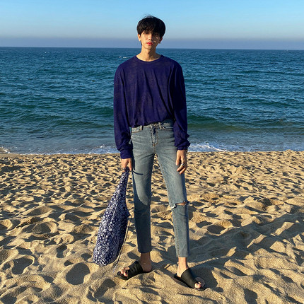 MRCYC韩国九分牛仔裤男韩系潮流修身破洞长裤子直筒锥形9分小脚裤