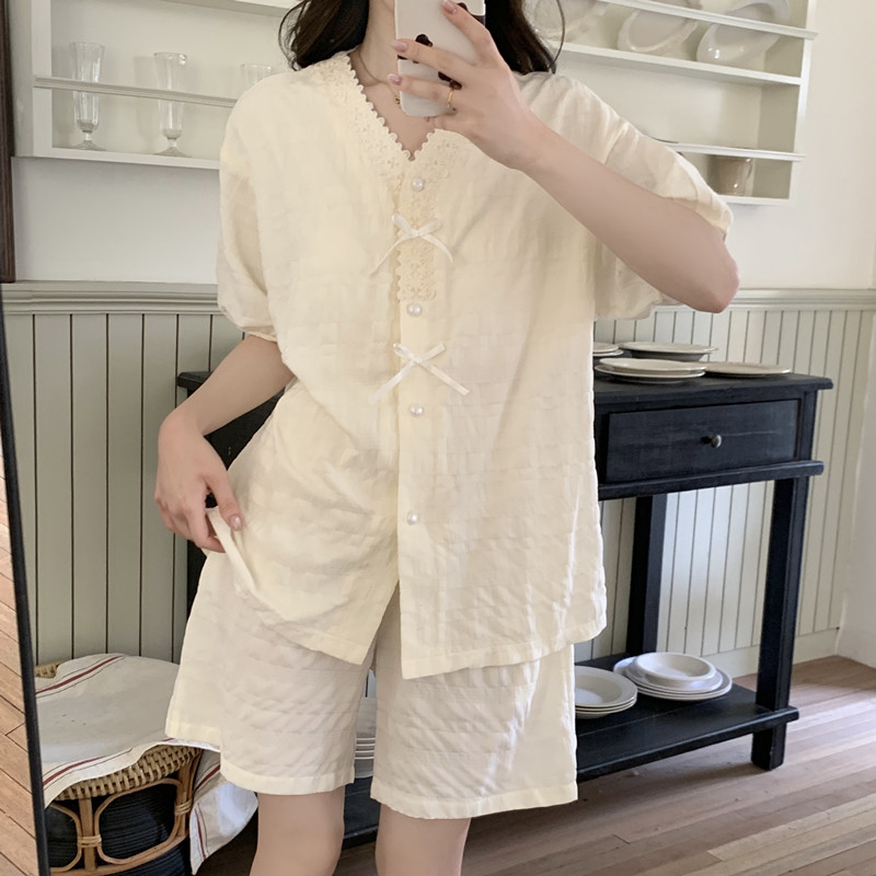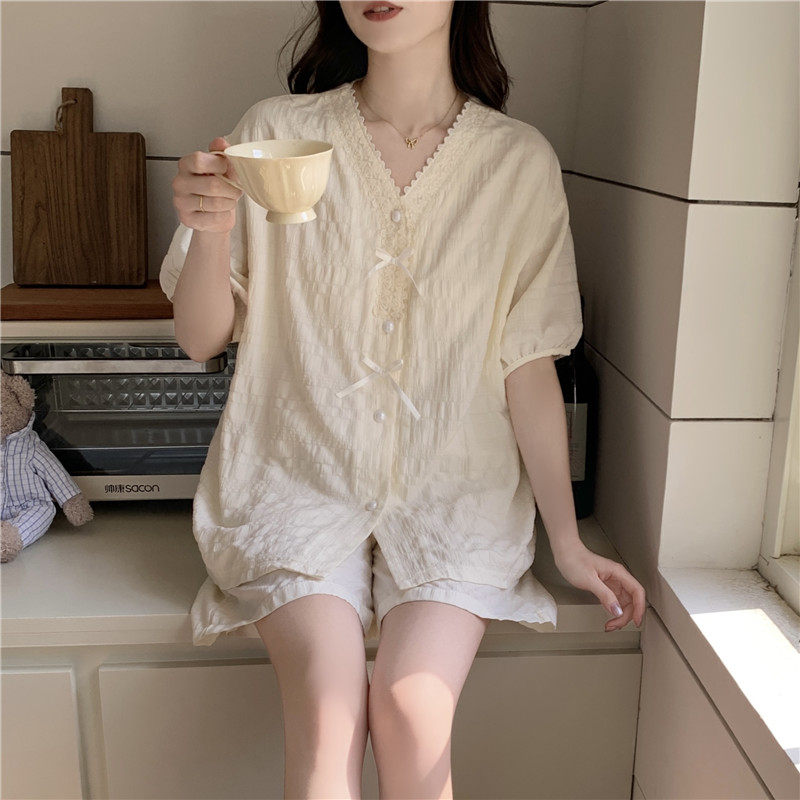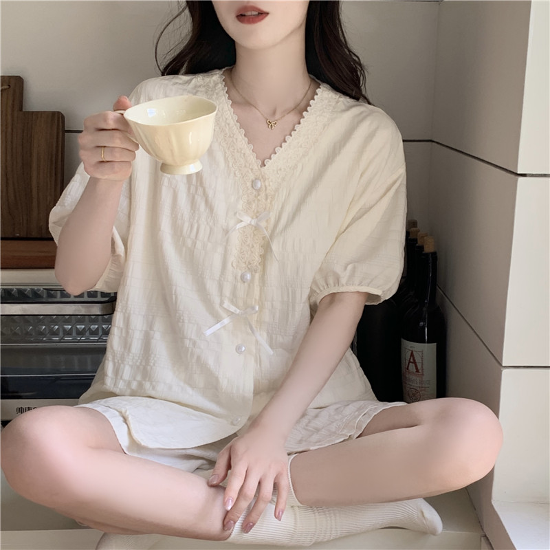 韩系ins纯棉睡衣女款夏季带胸垫2025新款短袖短裤杏色家居服套装