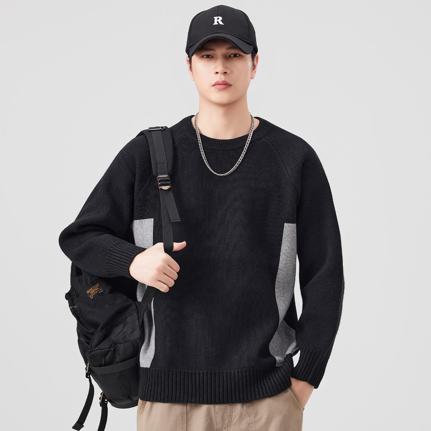 以纯拼接圆领毛衣男士日系宽松百搭休闲针织衫潮流秋冬季外套