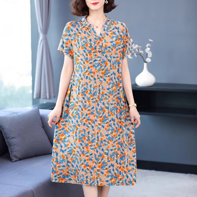 中老年碎花棉绸连衣裙夏季新款女士气质高端妈妈夏装过膝棉麻裙子